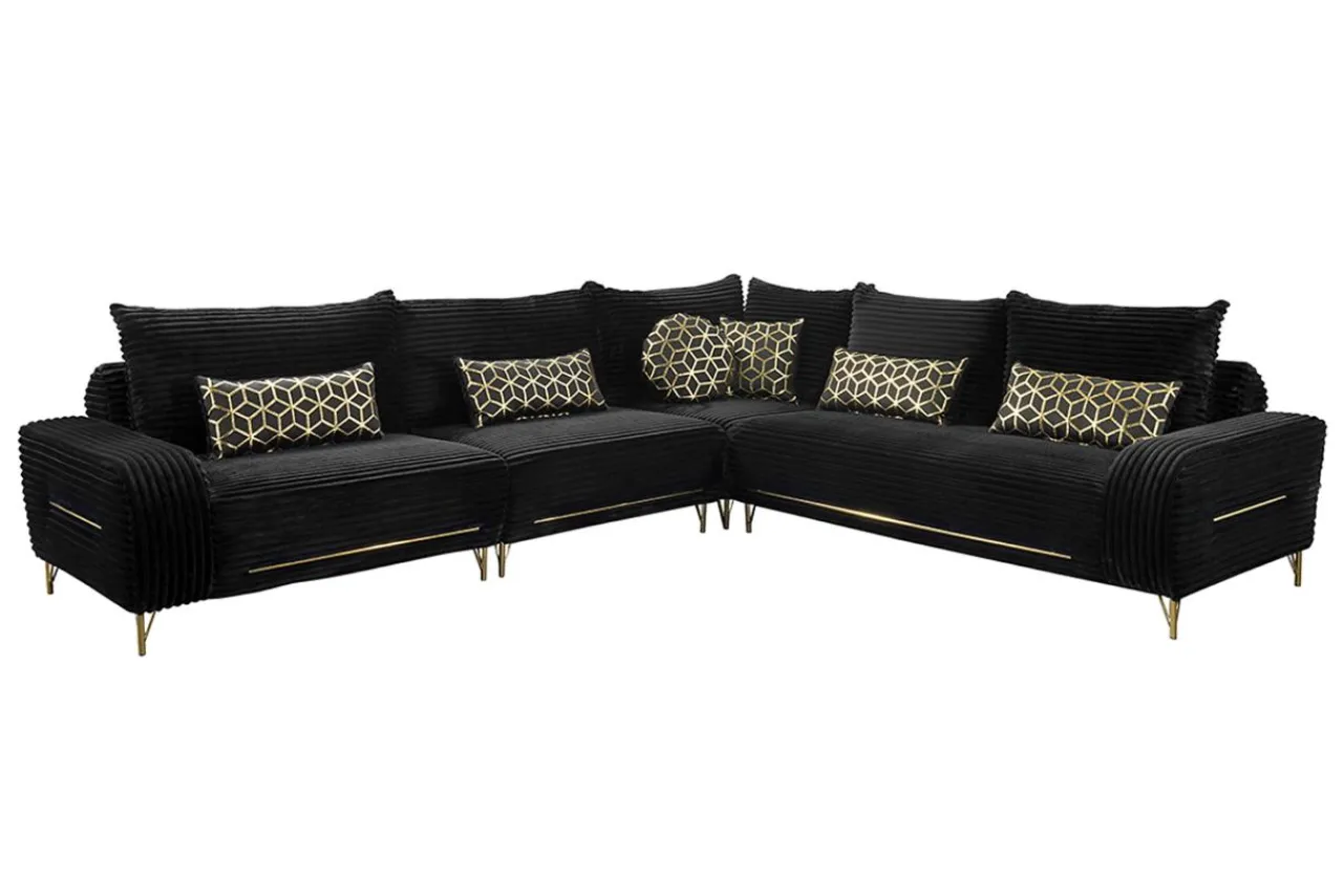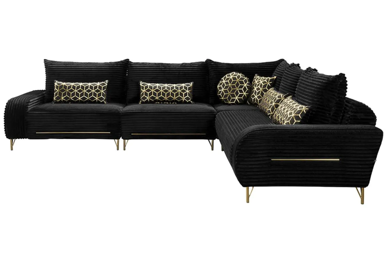 - Narożnik świetnie sprawdzi się w dużym, otwartym salonie. Czarny sztruks i złote dodatki tworzą mebel, który wpasuje w nowoczesne i glamour wnętrza. Geometryczne wzory na poduszkach będą świetnie wyglądać także w afrykańskich aranżacjach.