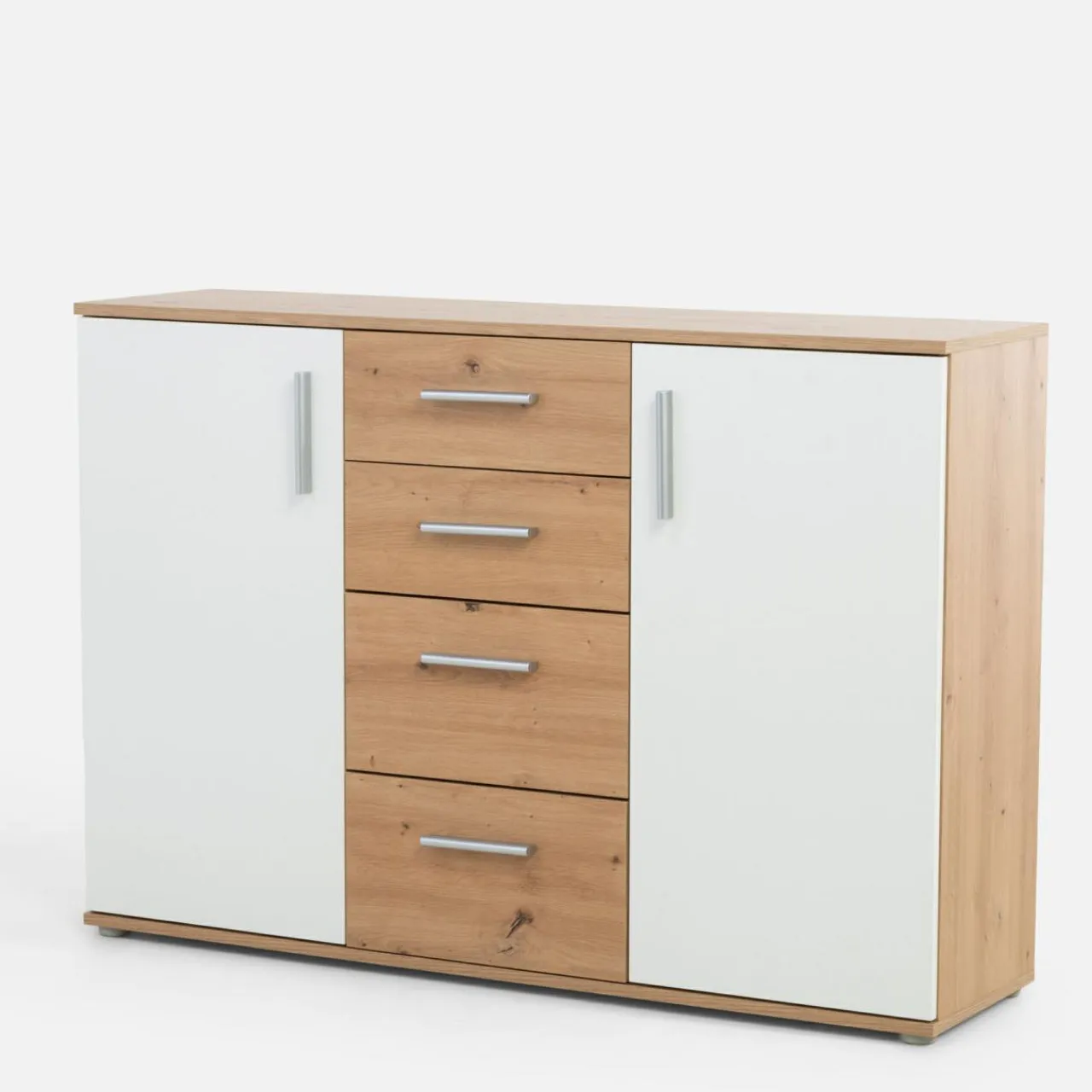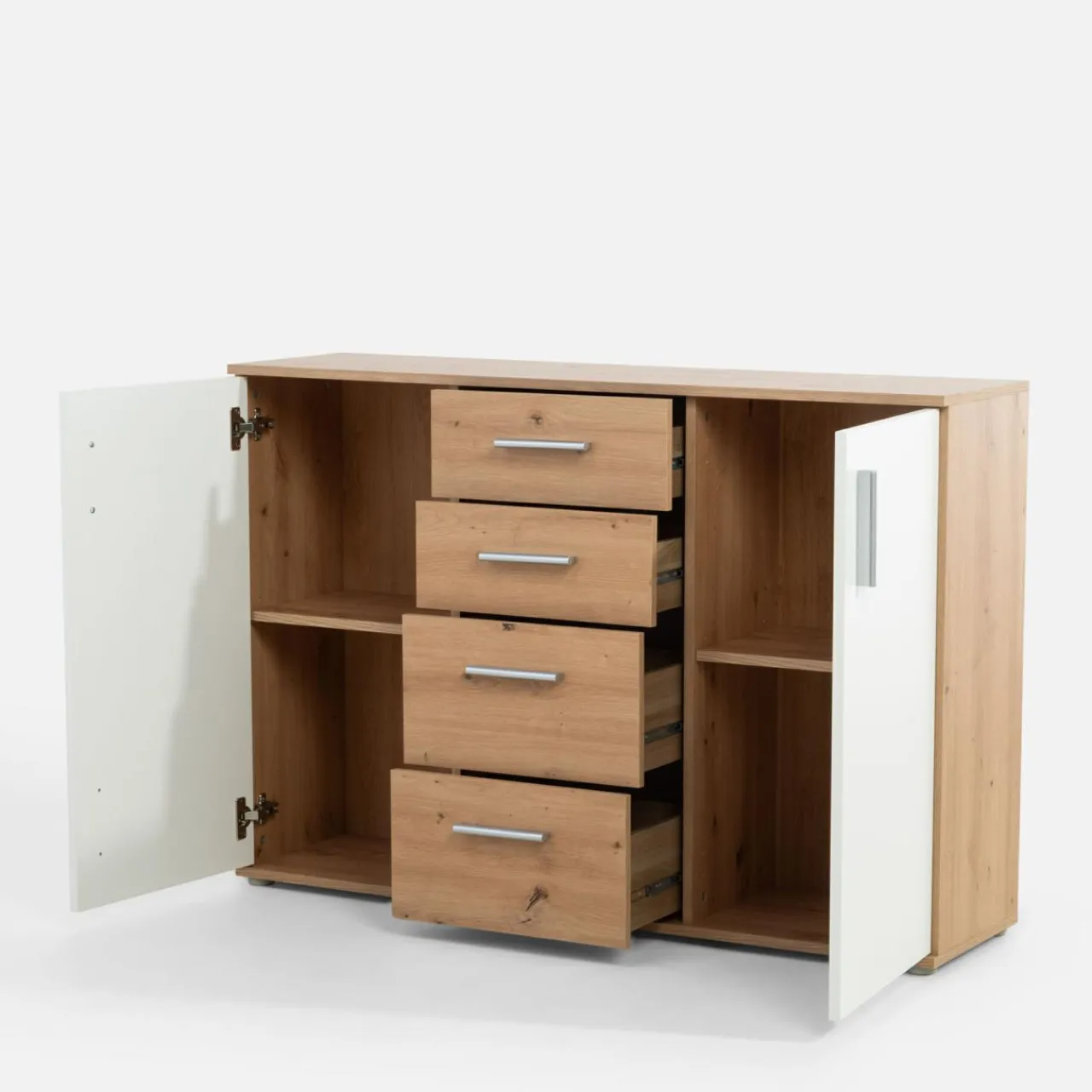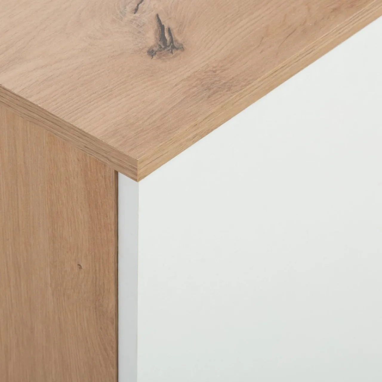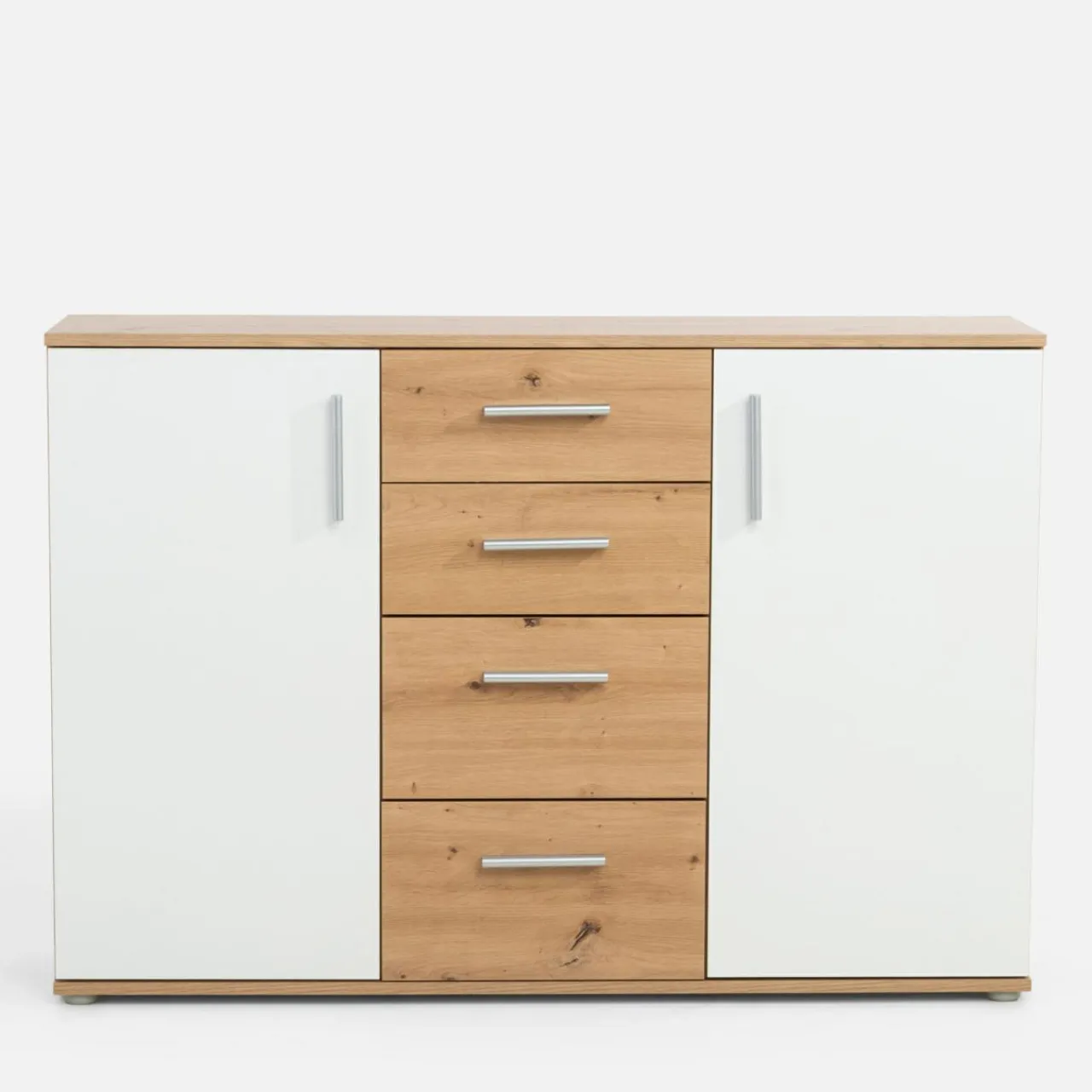 Komody IKOLI łączą nowoczesny design z praktycznym przechowywaniem. Jasne fronty i korpus w odcieniu dębu artisan dodają wnętrzu lekkości. Różne układy – od prostych dwudrzwiowych modeli po warianty z szufladami – sprawdzą się w salonie, sypialni czy biurze.