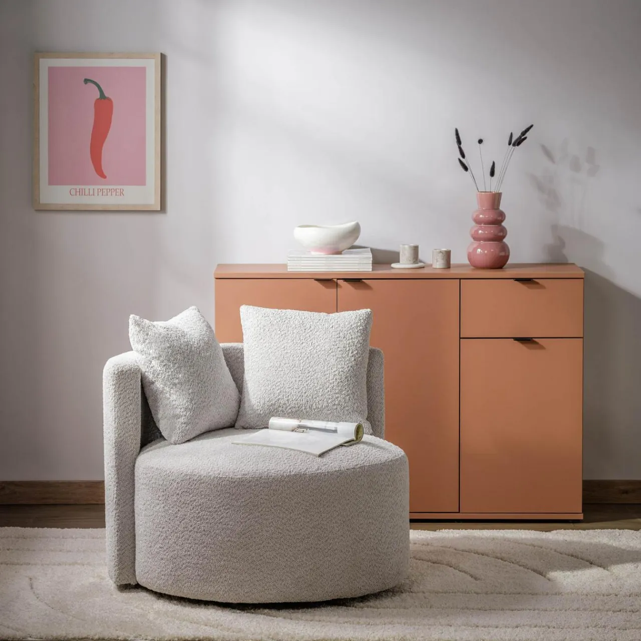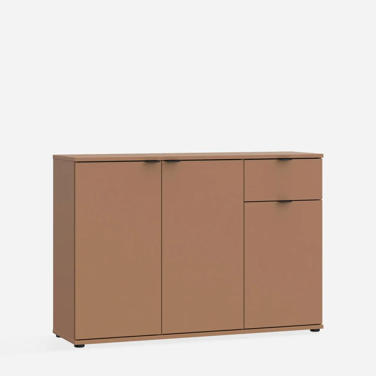 Komoda 3-drzwiowa z szufladą GANYMEDE w odcieniu terrakoty to propozycja do wnętrz o ciepłej atmosferze. Połączenie szafek i szuflady zapewnia wygodne przechowywanie.