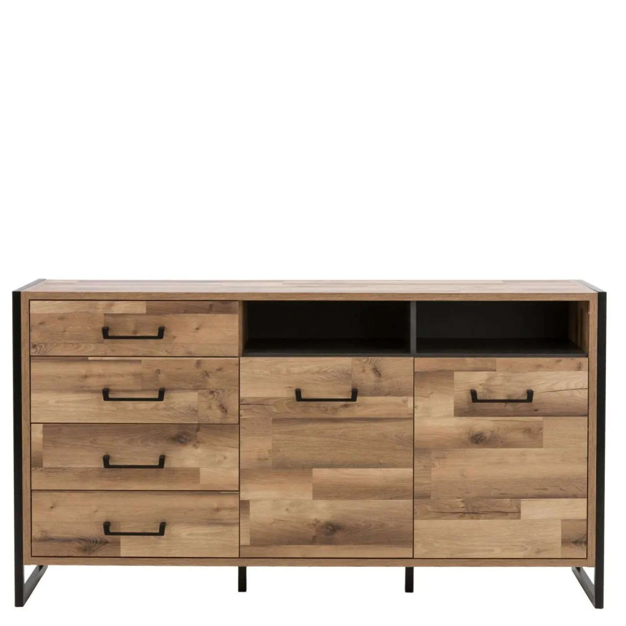 Komoda HUD została wykonana z płyty meblowej wykończonej folią. Gustownym dopełnieniem są metalowe uchwyty w czarnym kolorze, które korespondują z profilem spełniającym role nóżek mebla.