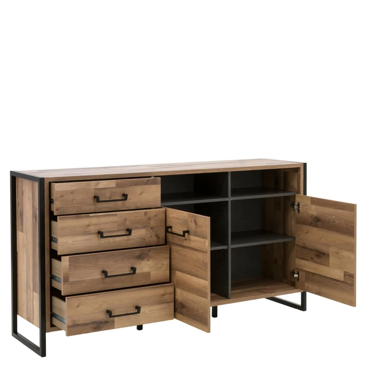 Komoda HUD posiada zamykaną szafkę z 4 półkami oraz 4 szuflady na prowadnicach kulkowych. 2 otwarte wnęki zostały umieszczone pod blatem. Półki posiadają możliwość obciążenia do 5 kg, natomiast blat 20 kg.