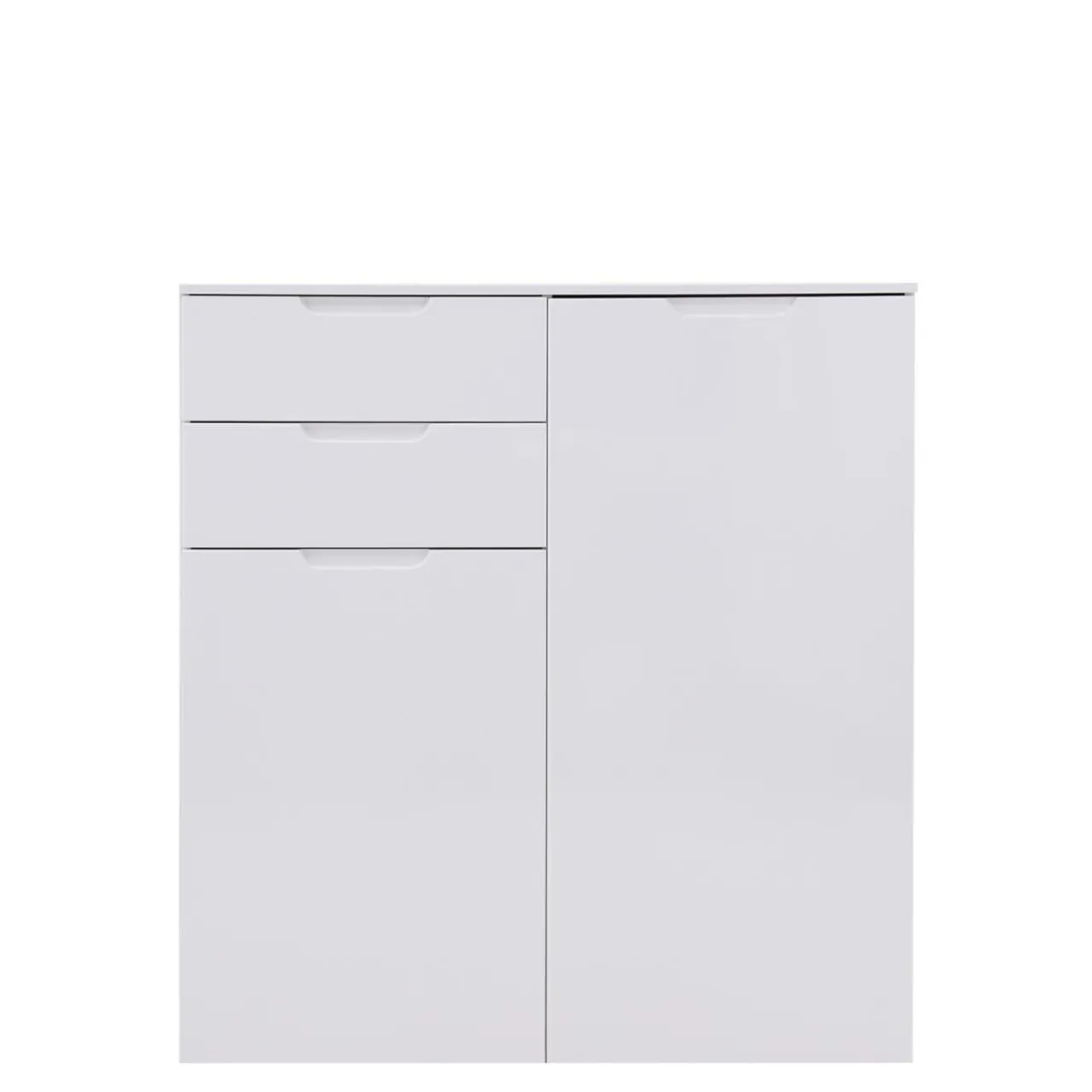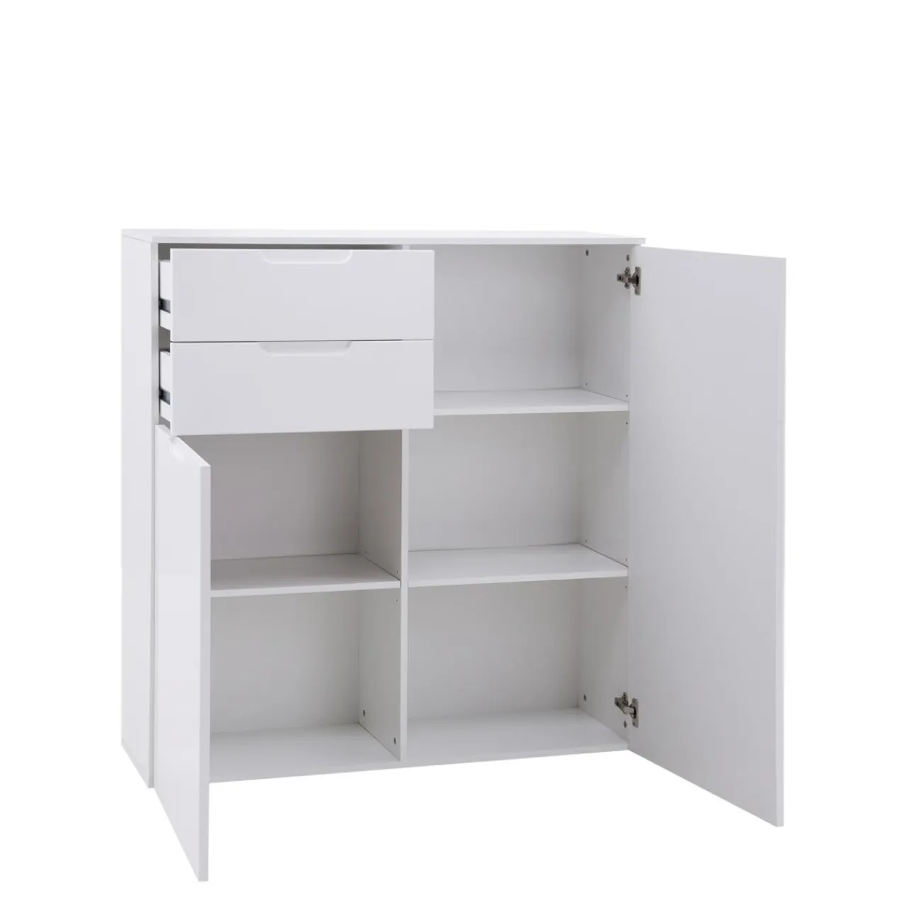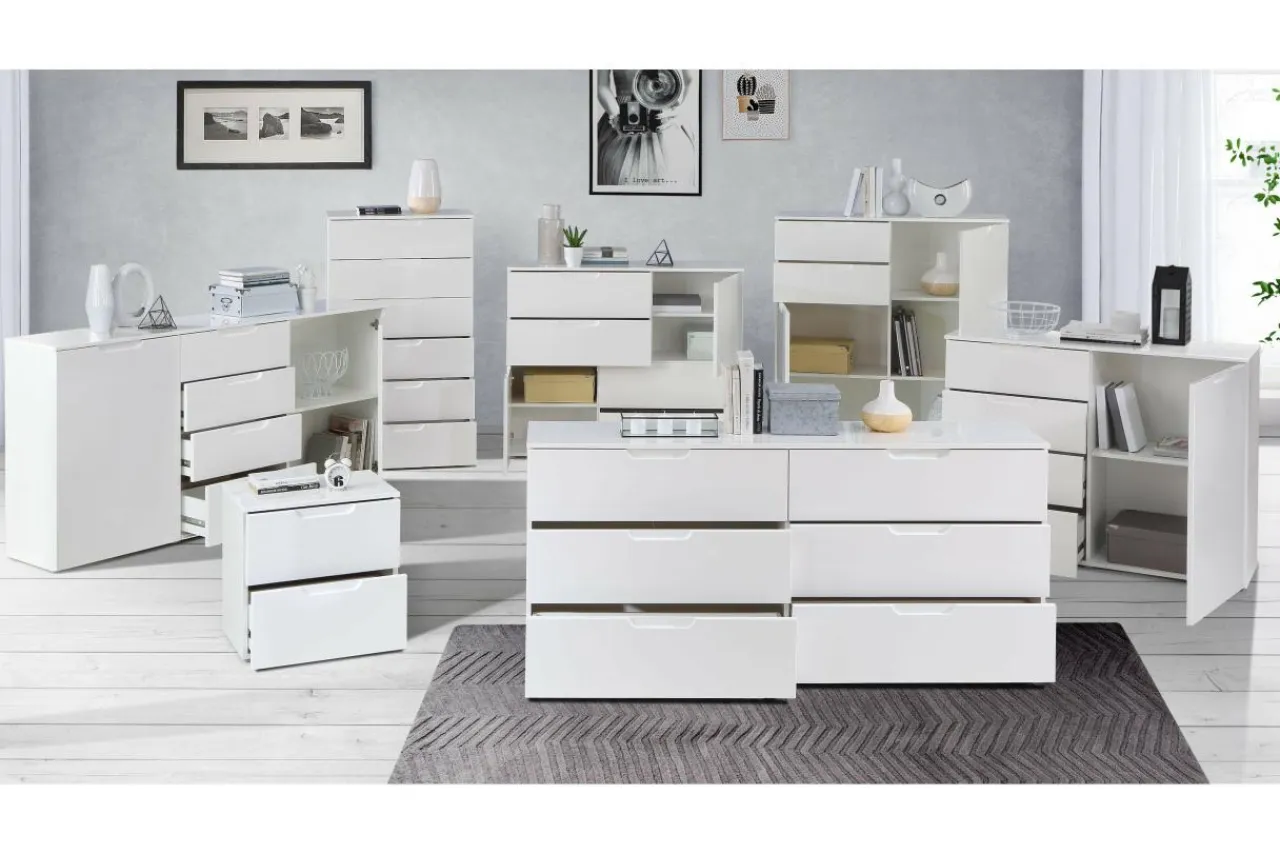 - Komoda wykonana jest z płyt meblowych i wykończona folią. Białe, połyskujące fronty powiększą optycznie przestrzeń.