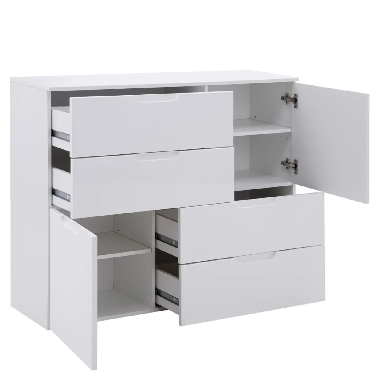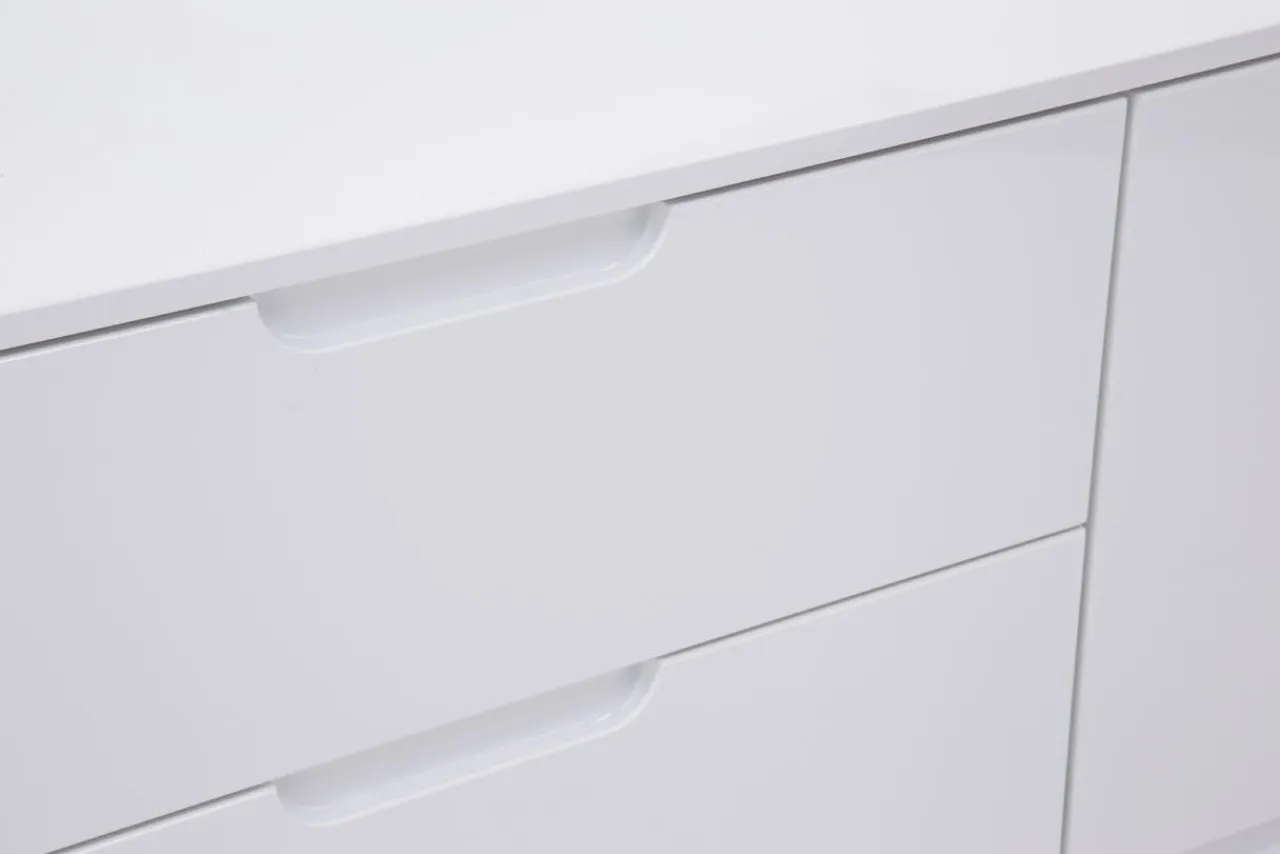 - Komoda wykonana jest z płyt meblowych i wykończona folią. Białe, połyskujące fronty rozświetlą i ożywią pomieszczenie.
