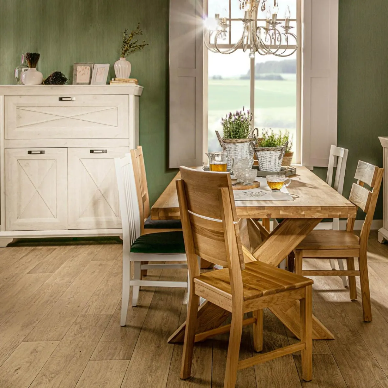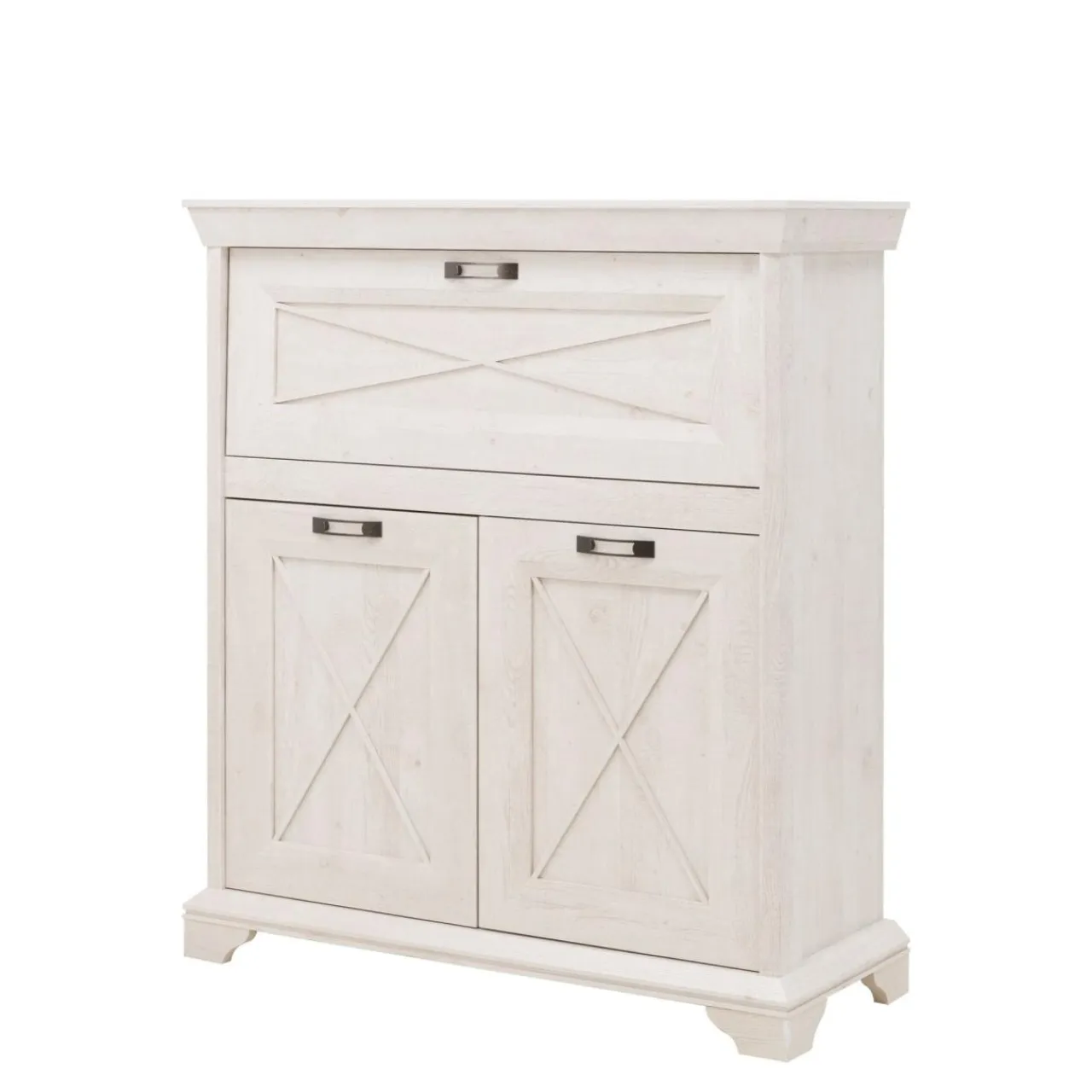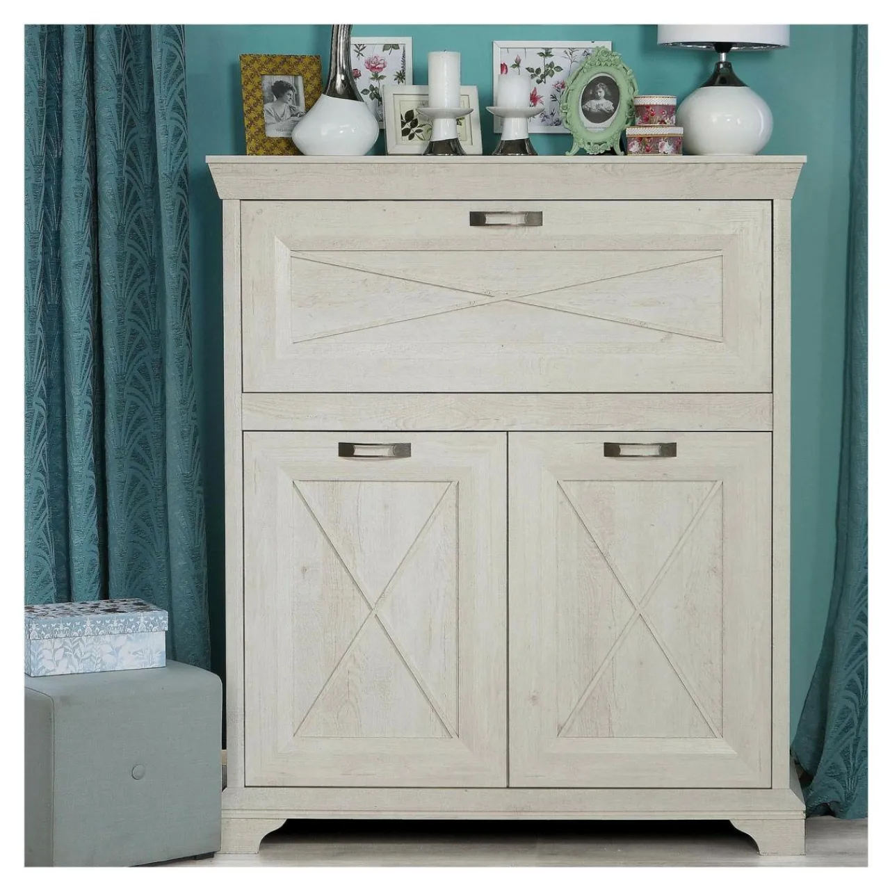 Wybarwienie w chłodnym odcieniu wpasuje się w większość współczesnych wnętrz. Komodę wykończono folią imitującą strukturę sosnowego drewna (pinia biała), dzięki czemu zyskuje ona nietuzinkowy wygląd.