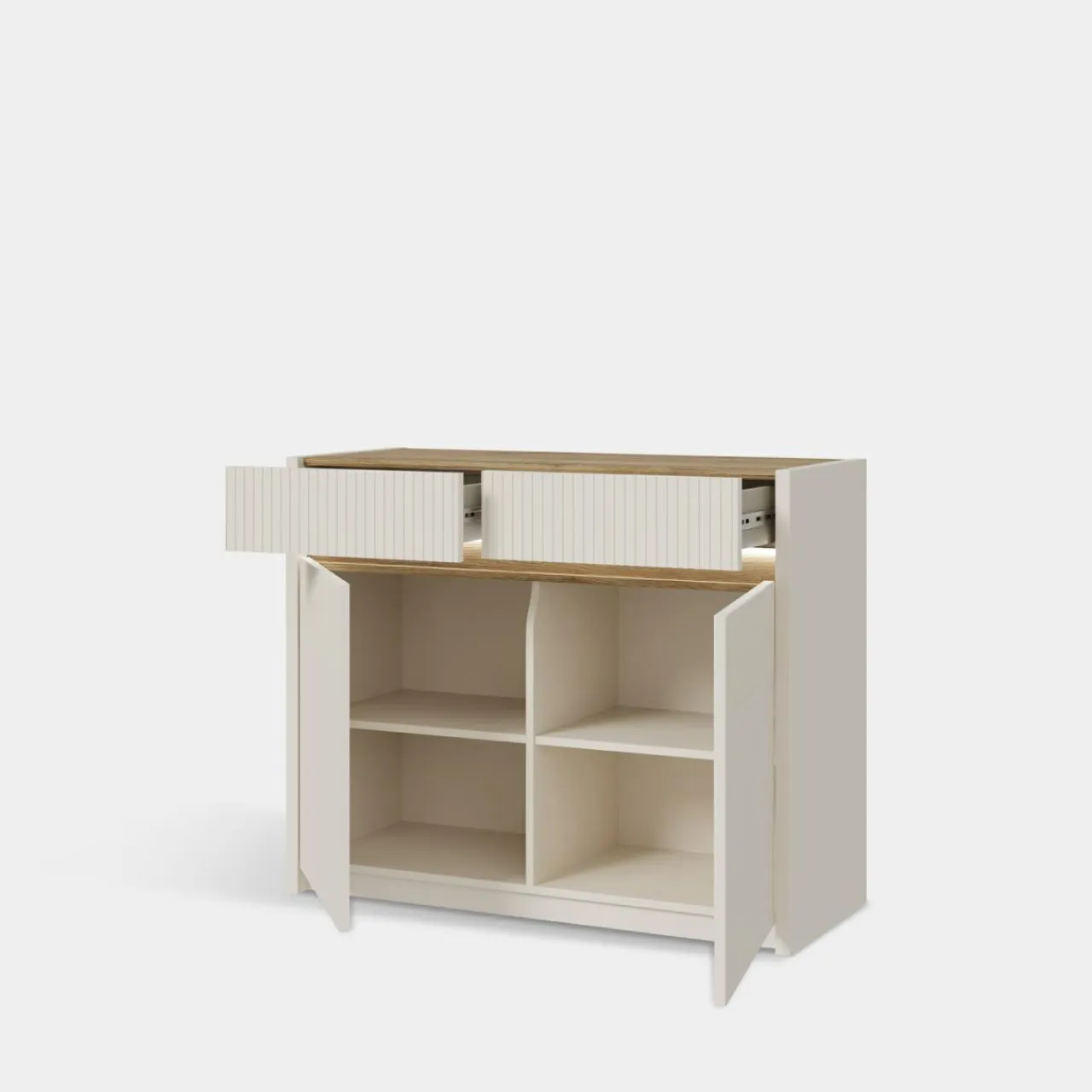 Komoda OAK SQUERE ma zaledwie 105,3 cm szerokości a oferuje miejsce w 2 szufladach i w 4 wnękach zamkniętych.