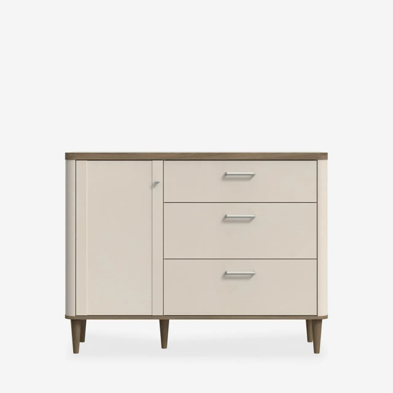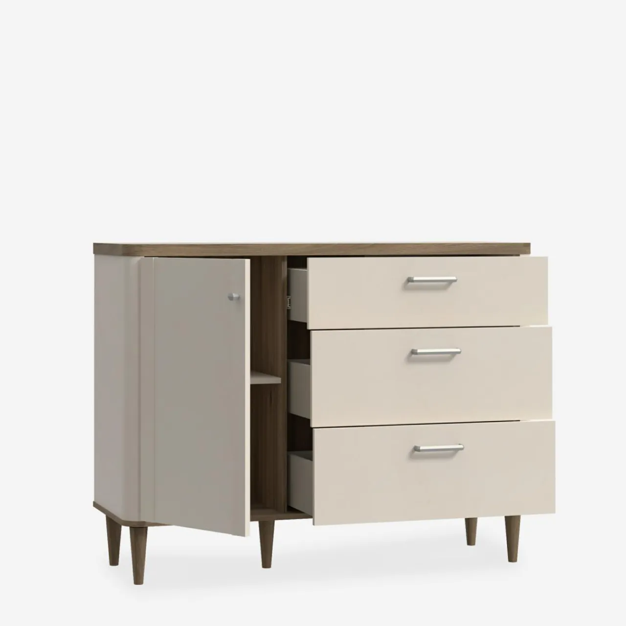 - Delikatnie zaokrąglone kształty korpusów, blatów i nóżek dodają lekkości, wprowadzając harmonię do wnętrza.