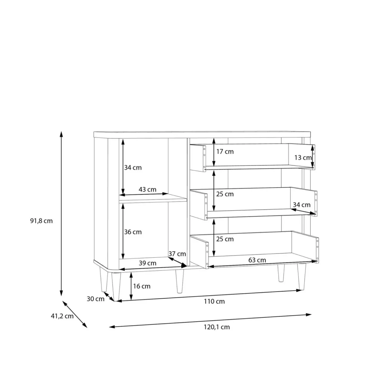 - W 3 pojemnych szufladach przechowasz wiele mniejszych przedmiotów. Żadna rzecz Ci nie umknie dzięki pełnemu wysuwowi.