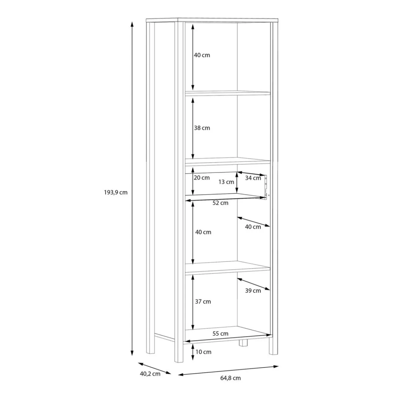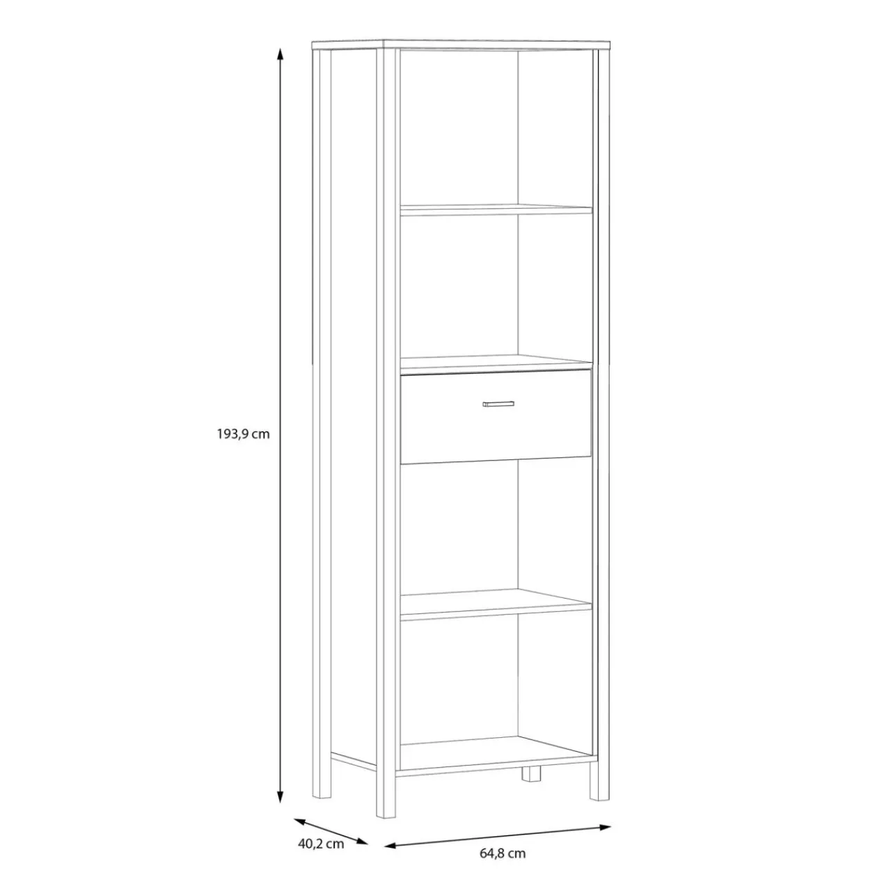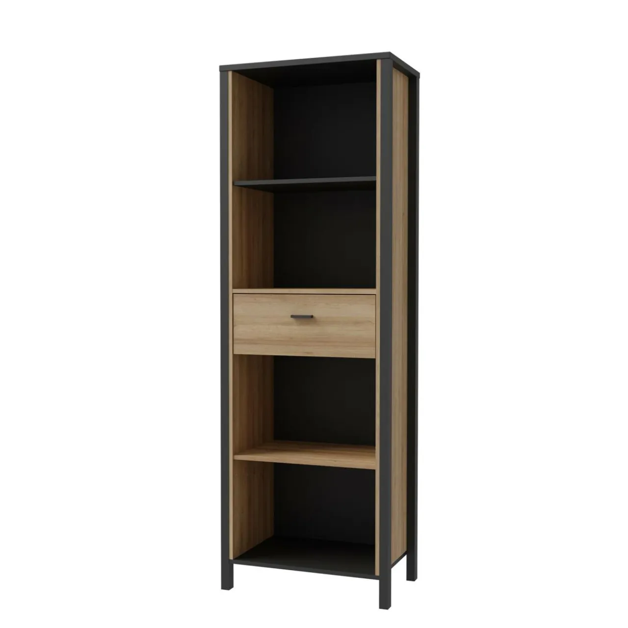 - Regał posiada 1 szufladę, wyposażoną w prowadnice kulkowe oraz 4 otwarte wnęki.