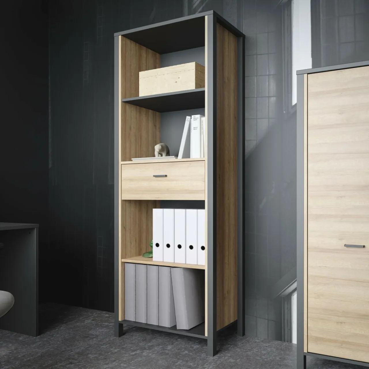 Jest idealny do uporządkowania książek, materiałów biurowych i dokumentów. Jego charakterystyczny design pomoże Ci zaprojektować wnętrze w industrialnym stylu.