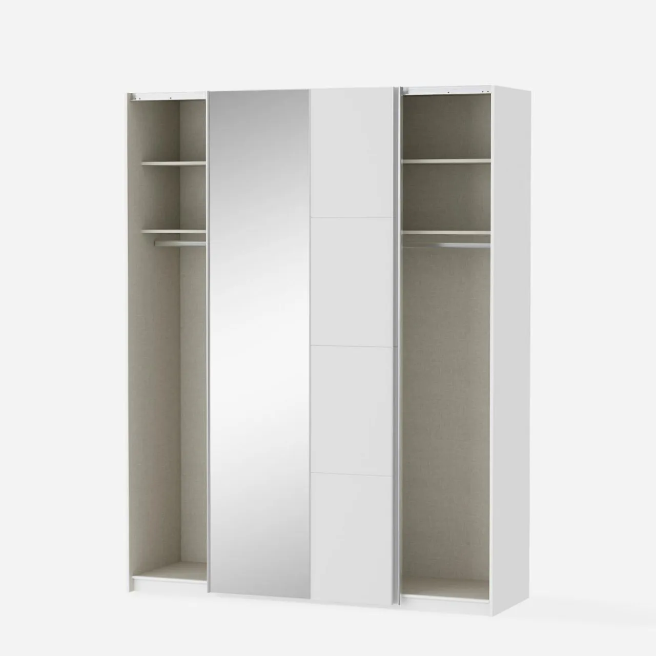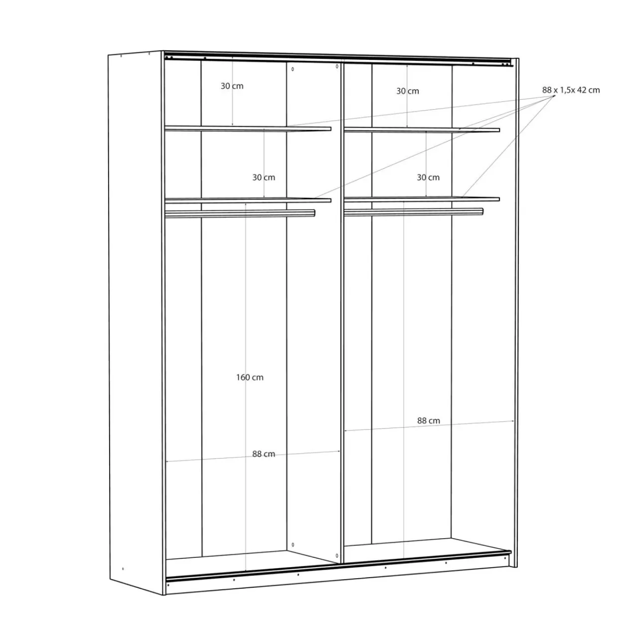 - Podzielona na dwie części — równomierne ułożenie półek i drążków w szafie umożliwia podzielenie wnętrza na różne sposoby; osobna część dla Ciebie i partnera lub dwójki rodzeństwa.