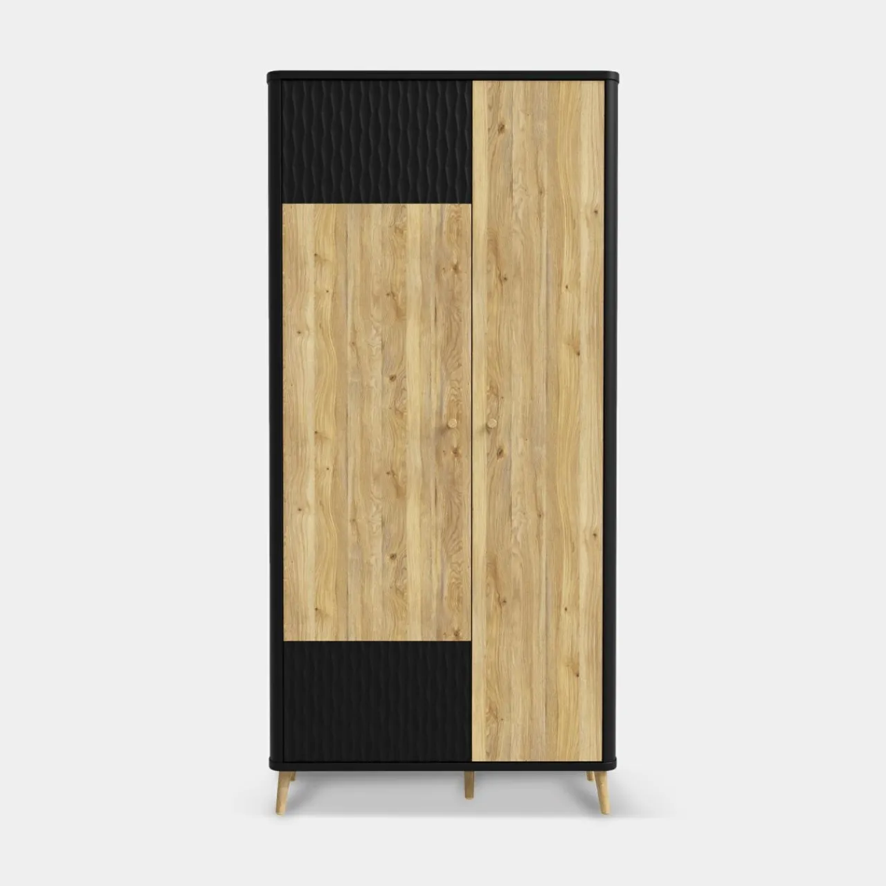 - Nietuzinkowe wzornictwo czarnych frontów tworzy kontrast dla rysunku drewna w odcieniu mauvella oak.