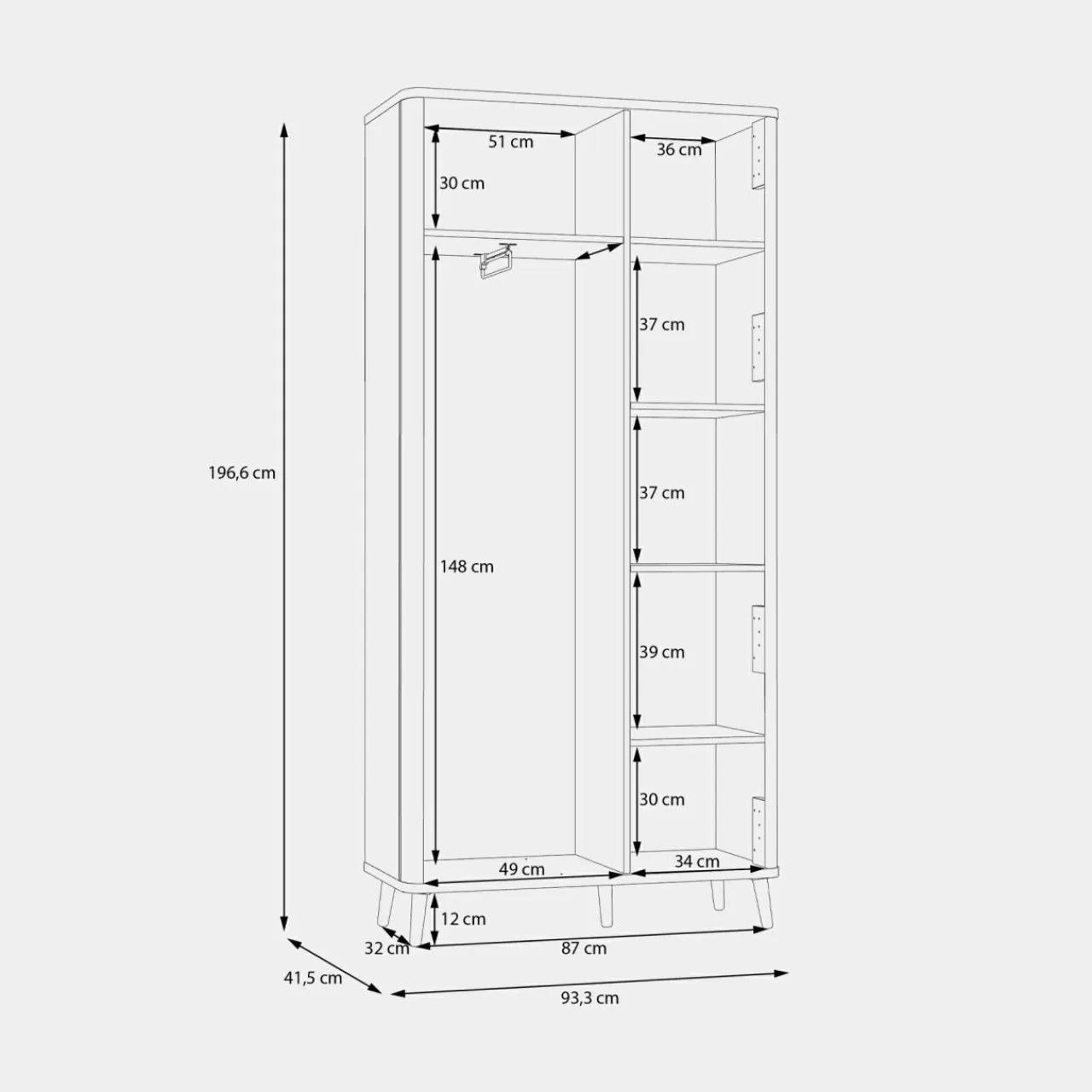 - Wnęki posiadają aż 15 kg obciążenia, umożliwiając poukładanie większej ilości ubrań.