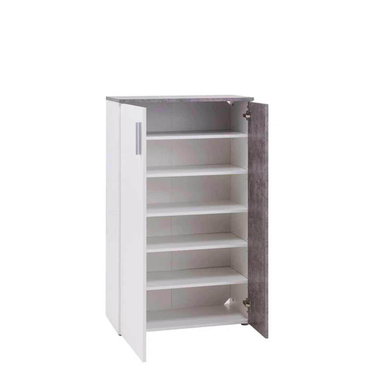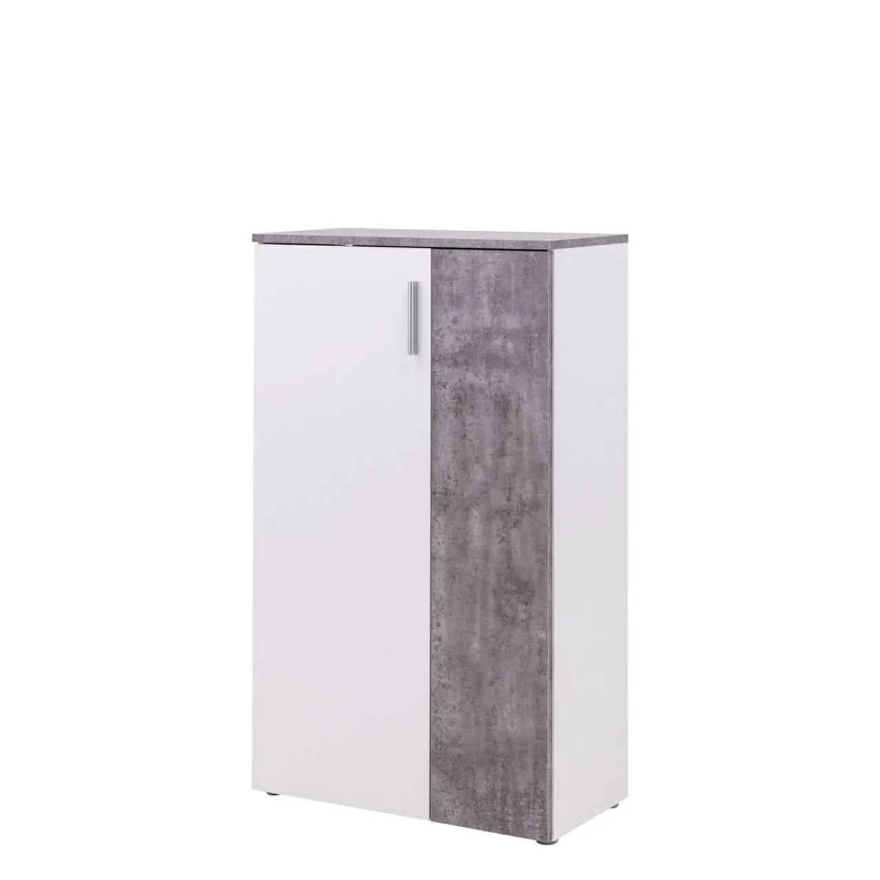 Szafka ma wystarczającą pojemność dla całej rodziny. Kolorystyka szafki to jasnoszary beton i biel, która świetnie wpisuje się w aktualne trendy.