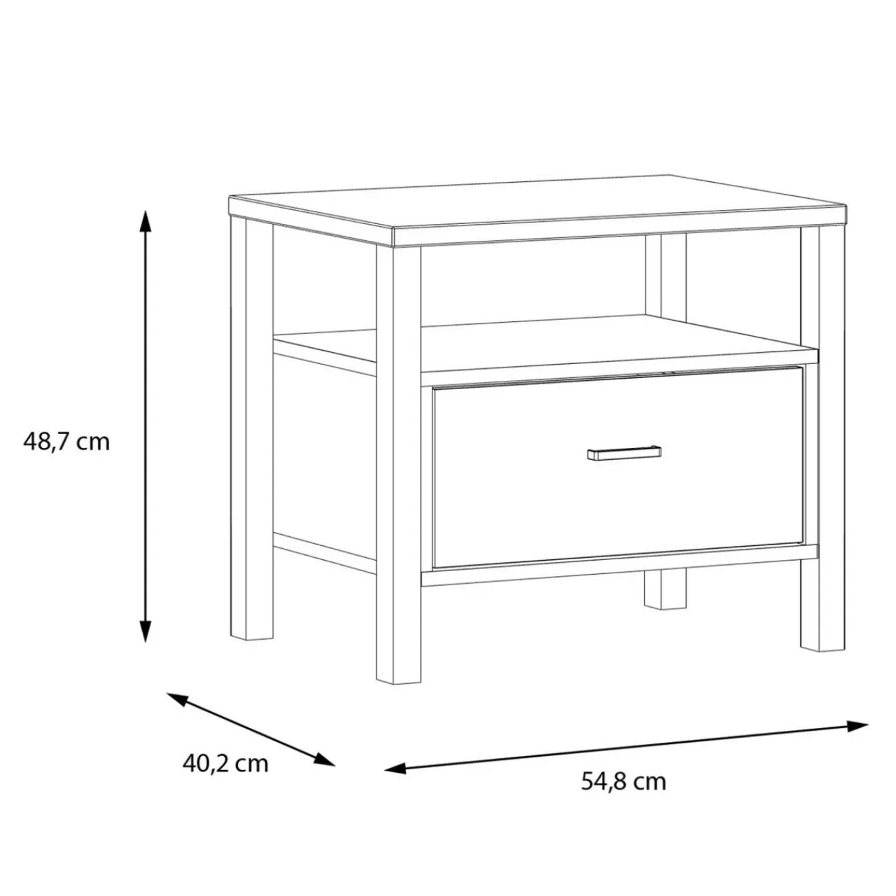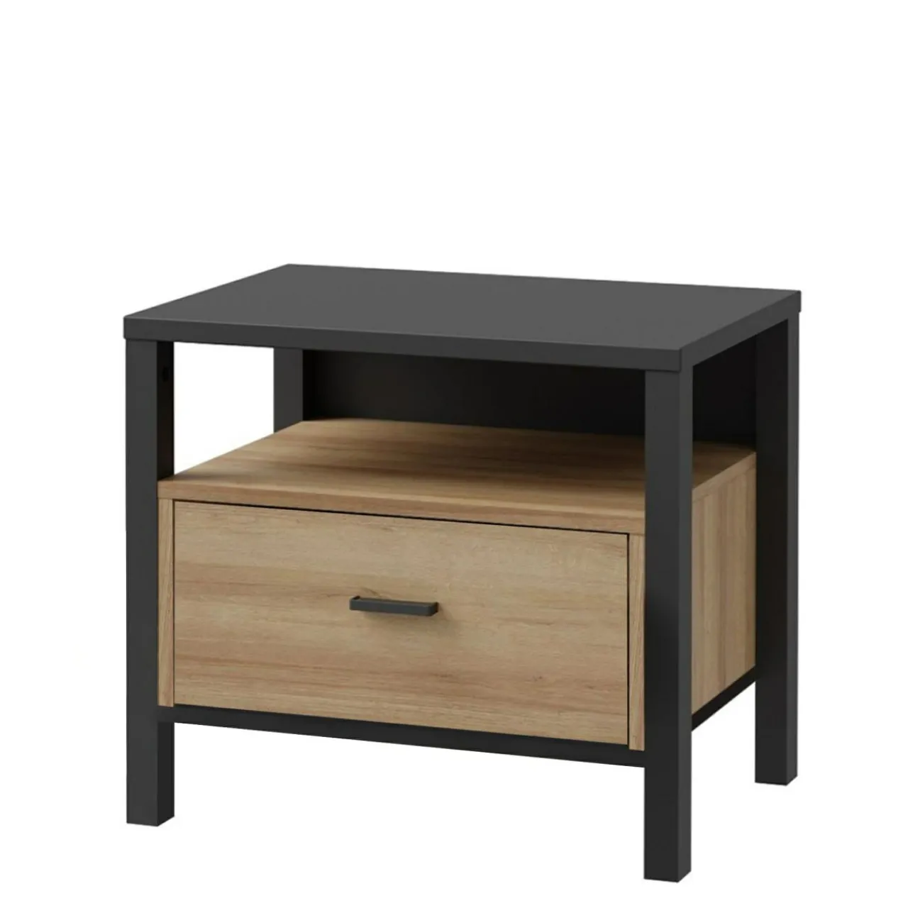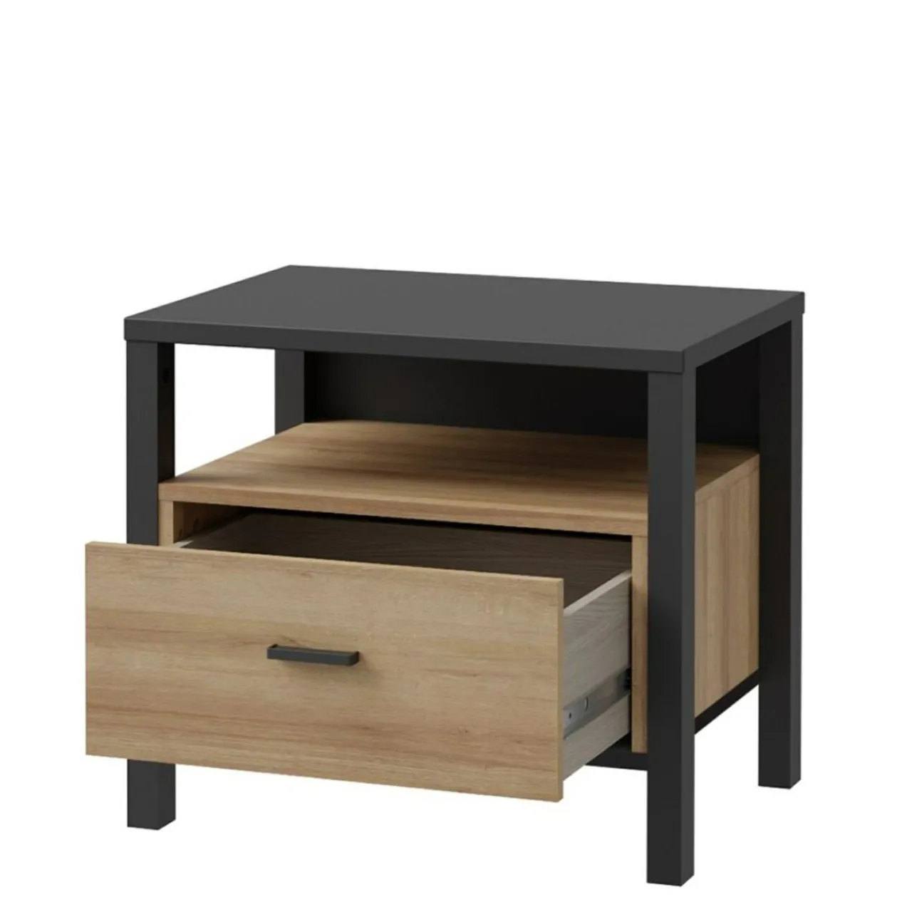 Szafka nocna posiada 1 szufladę na prowadnicach kulkowych oraz otwartą wnękę pod blatem. W jej wnętrzu możesz trzymać kosmetyki, książkę lub osobiste drobiazgi.