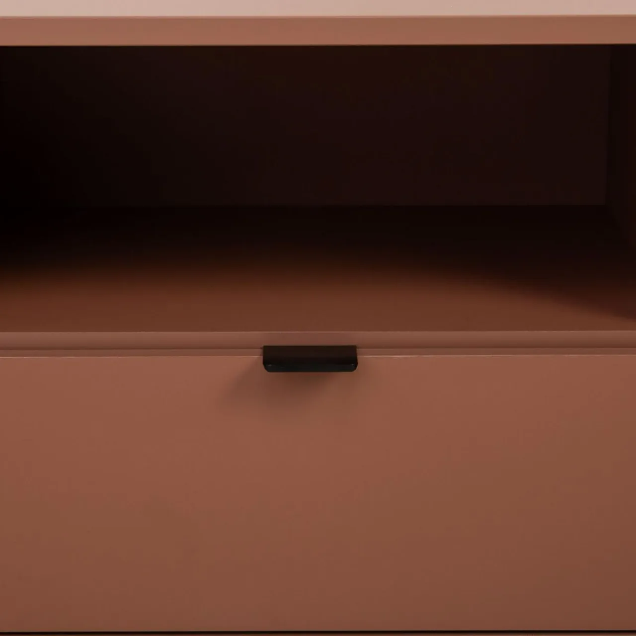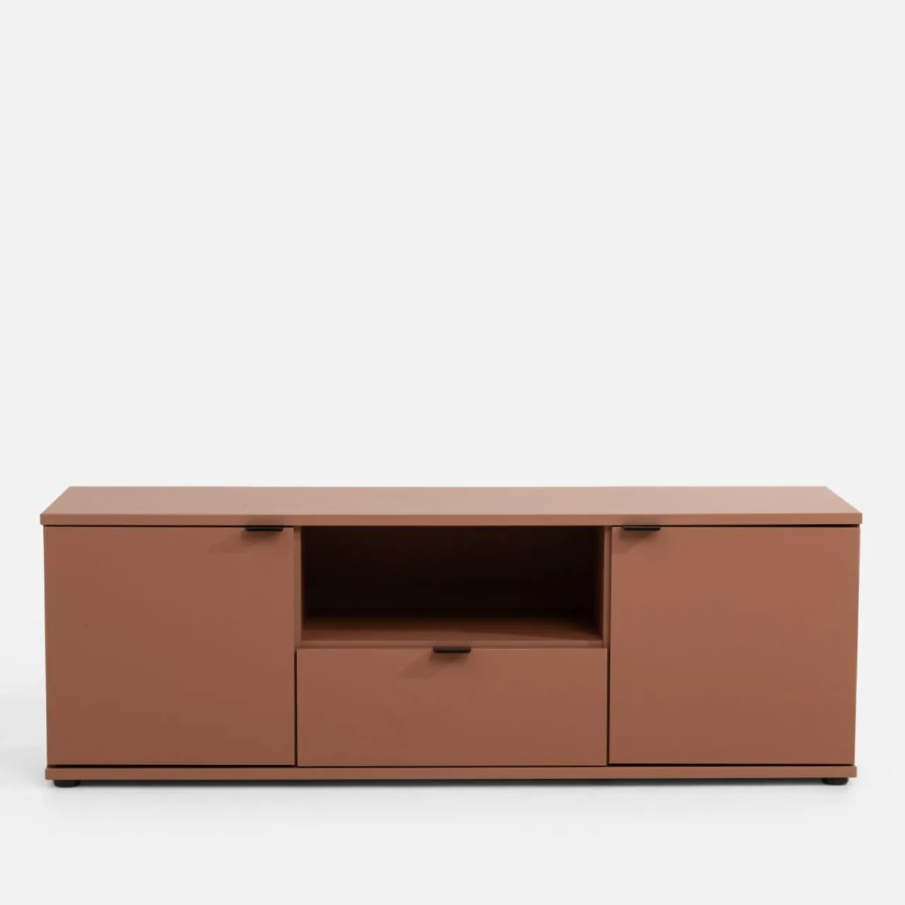 Szafka RTV GANYMEDE w odcieniu terrakoty to miejsce na sprzęt multimedialny i akcesoria.