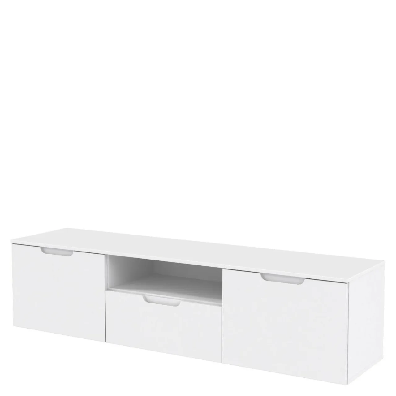 Niska szafka w białym kolorze estetycznie wkomponuje się we wnętrze salonu, powiększy optycznie przestrzeń.