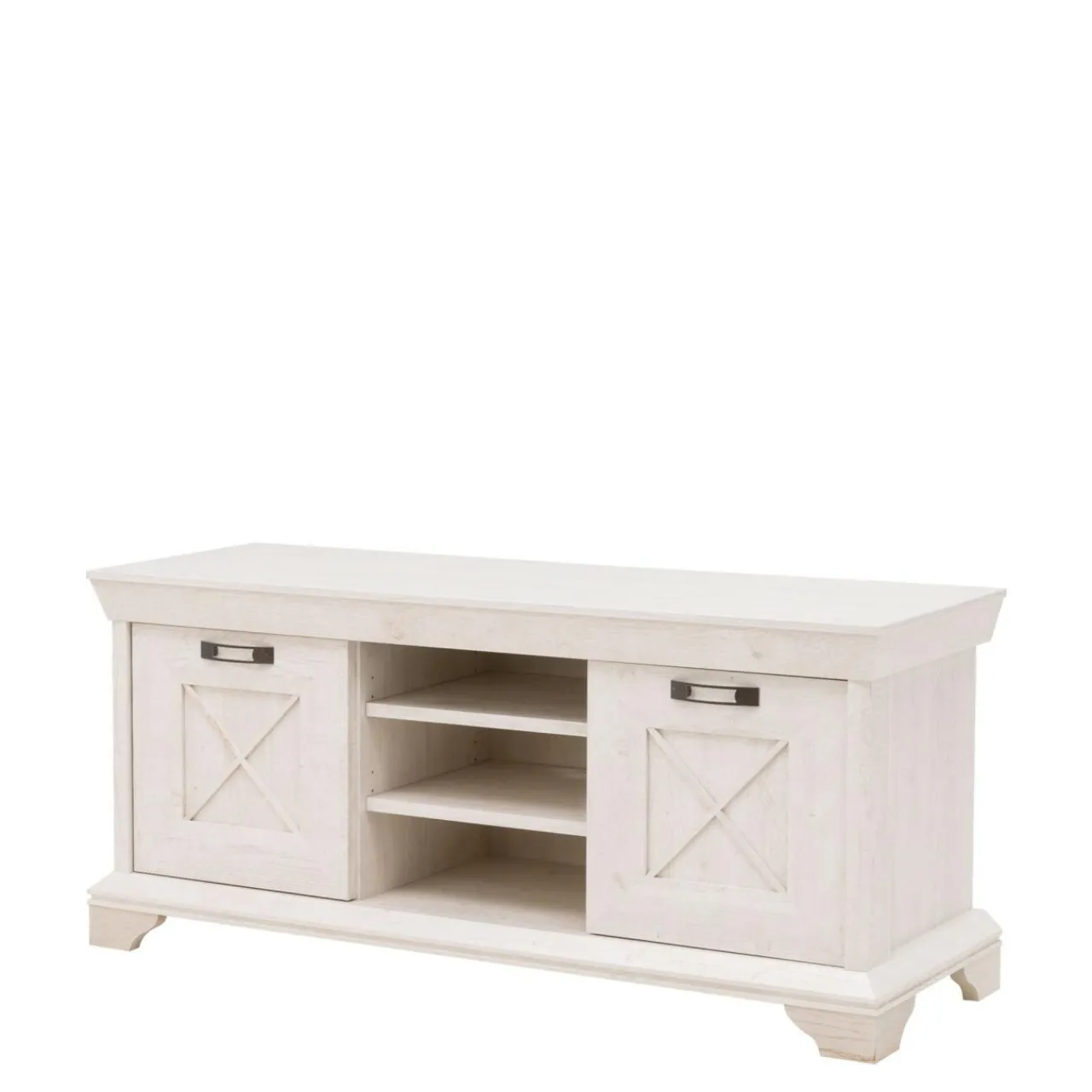 Dzięki szafce RTV KASHMIR konsekwentnie zrealizujesz swoją wizję salonu stylizowanego na wnętrza domostw z krainy lawendy. Bryła mebla umieszczona została na ozdobnym cokole, a metalowe uchwyty świetnie korespondują z jasnym wybarwieniem. Dodatkowym ozdobnym akcentem są skrzyżowane listewki na froncie szafki.