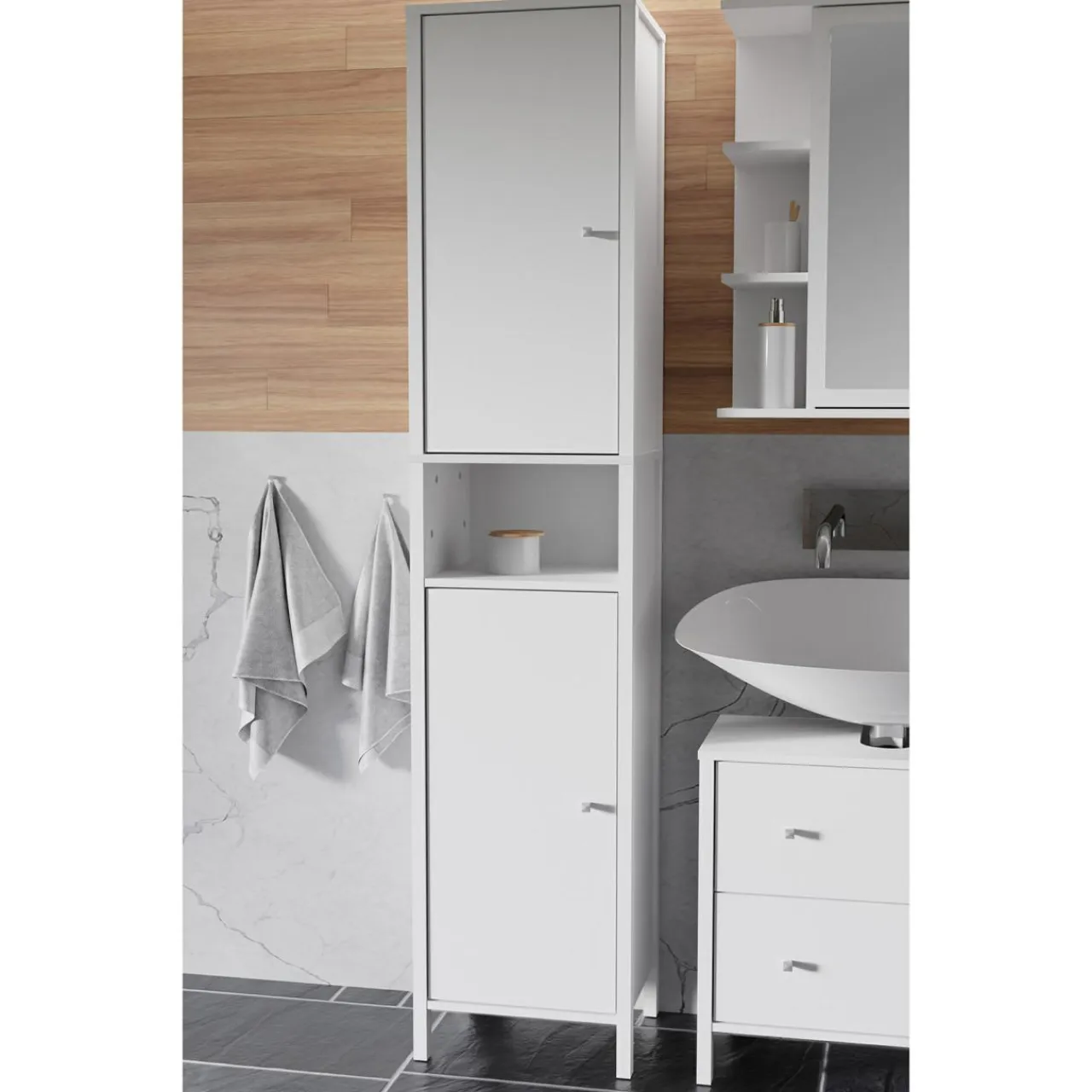 Szafka wysoka IPSARION pomieści zapas kosmetyków i ręczniki wszystkich domowników. W 2 zamykanych szafkach każdy znajdzie miejsce na swoje rzeczy.