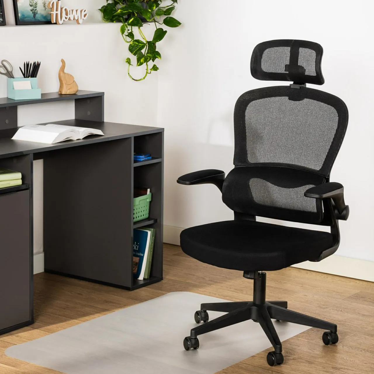 - Podłokietniki zostały wykończone miękkim obiciem, co zapobiega powstawaniu rys przy przysuwaniu fotela do biurka.