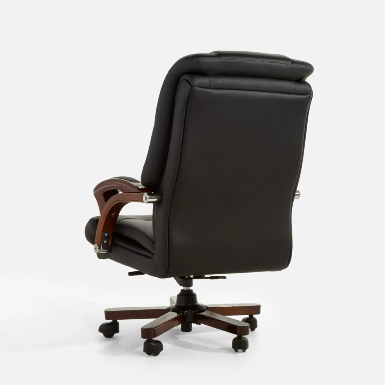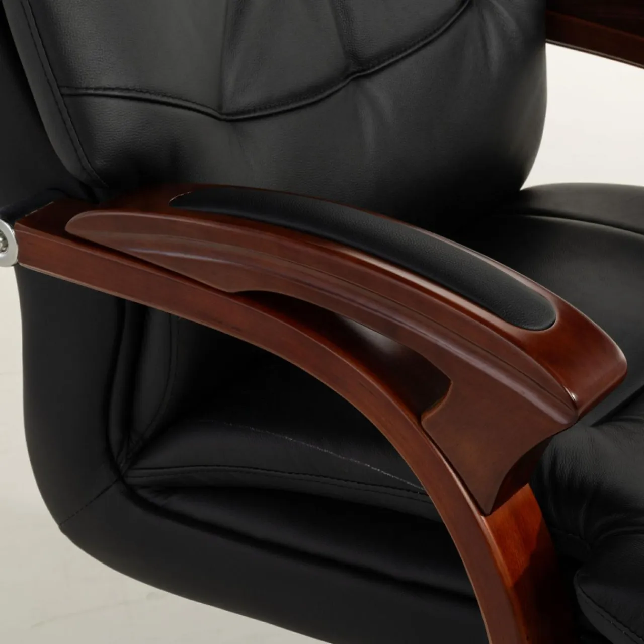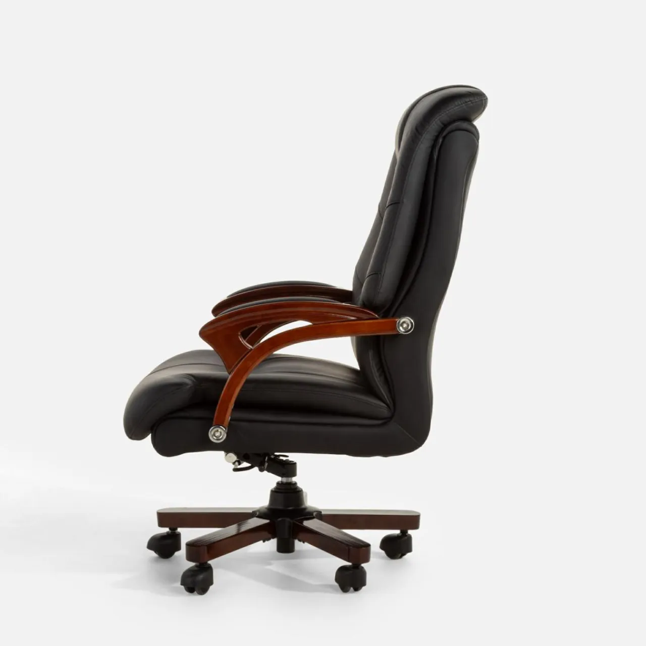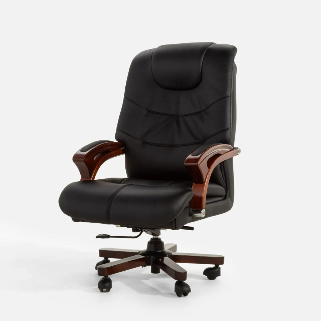 Fotel biurowy MONARCHE zapewni komfort podczas długich godzin pracy spędzonych przy biurku. Fotel łączy w sobie imitację ciemnego drewna oraz tapicerkę ze skóry naturalnej i eko-skóry w kolorze czarnym – dzięki temu prezentuje się on elegancko i będzie służył w gabinecie przez długie lata.