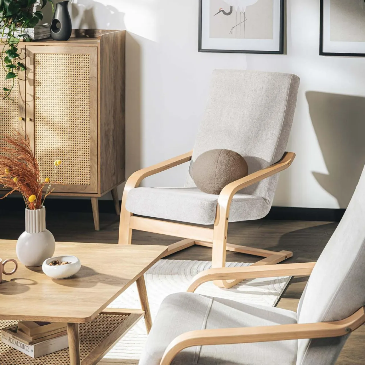 Bukowe drewno w kolorze naturalnym w połączeniu z ciekawą tkaniną tworzą wspaniałe zestawienie.