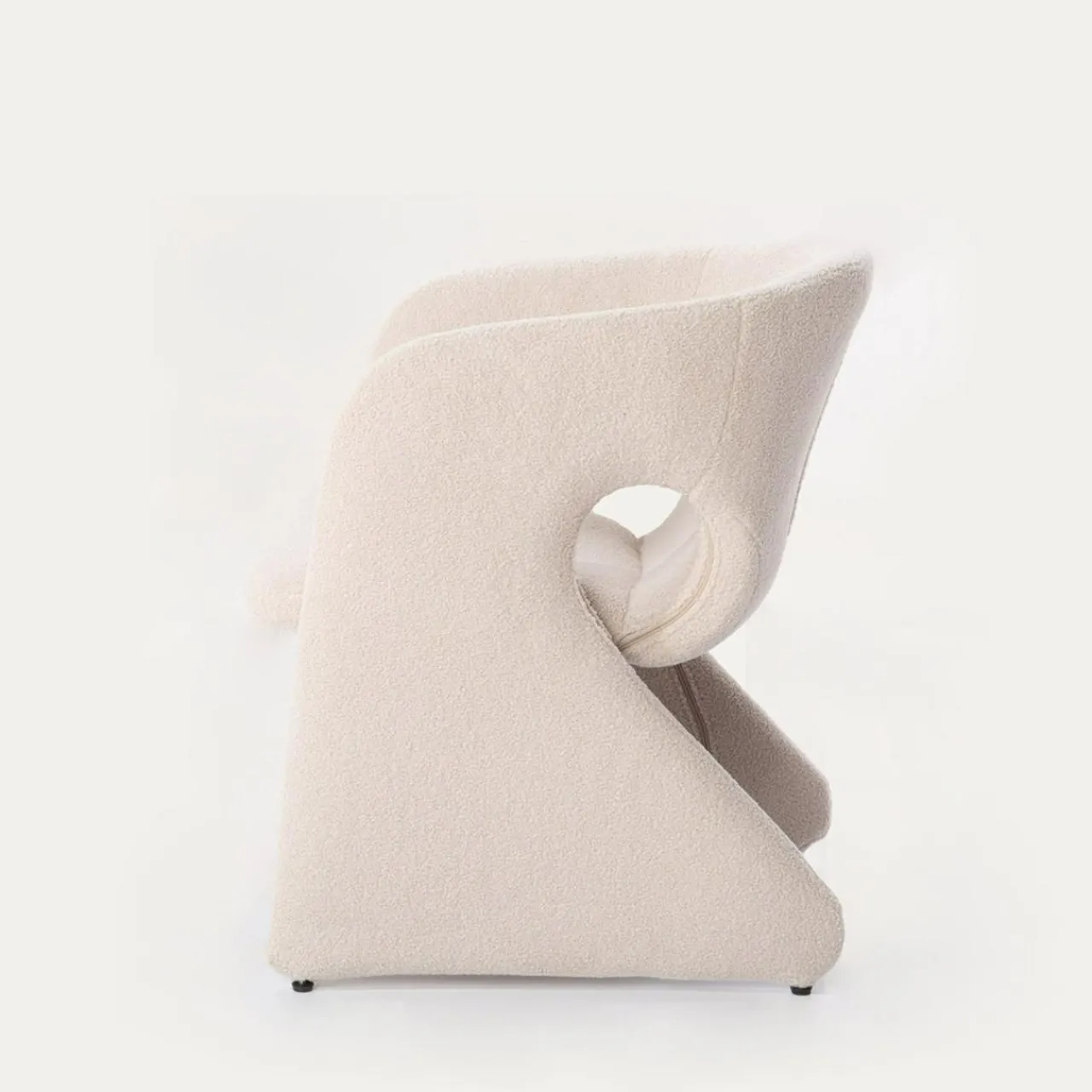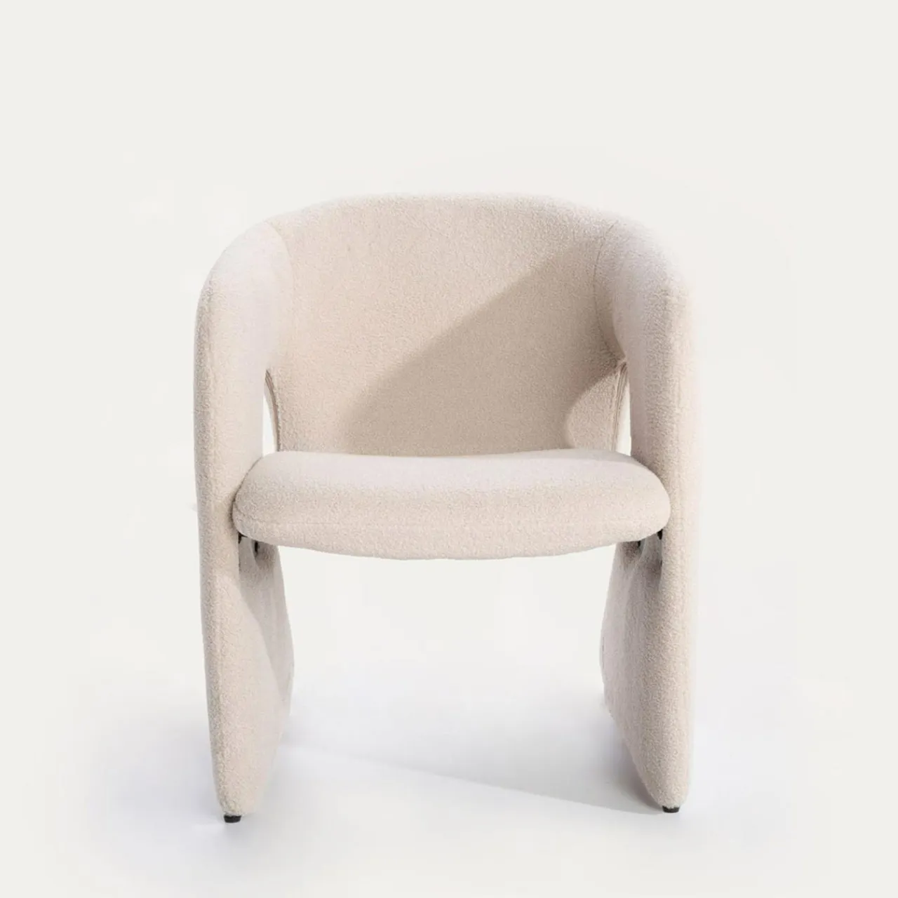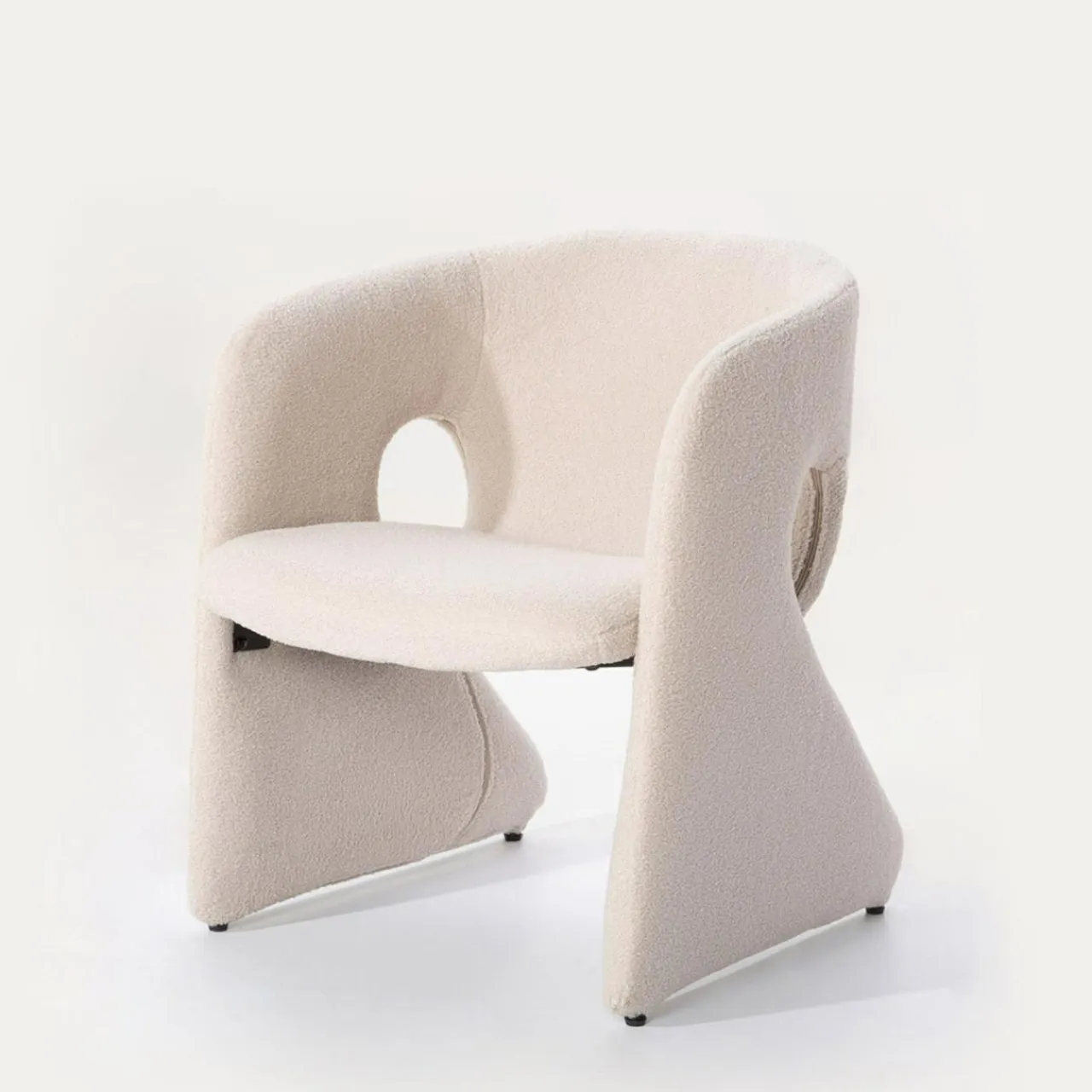 - Fotel pokryto miłą w dotyku tkaniną boucle w odcieniu beżowym. Siadając na nim, poczujesz przyjemną miękkość.