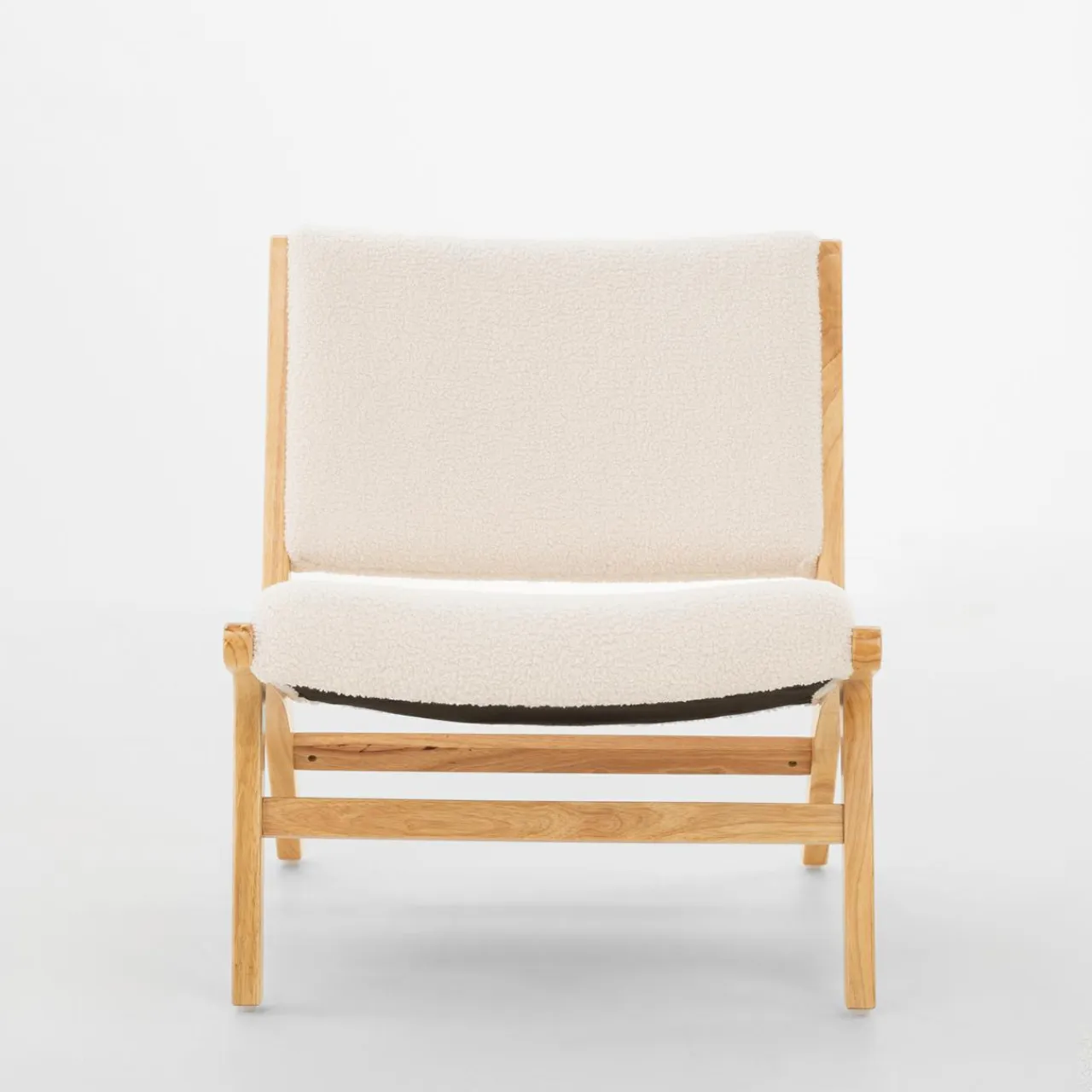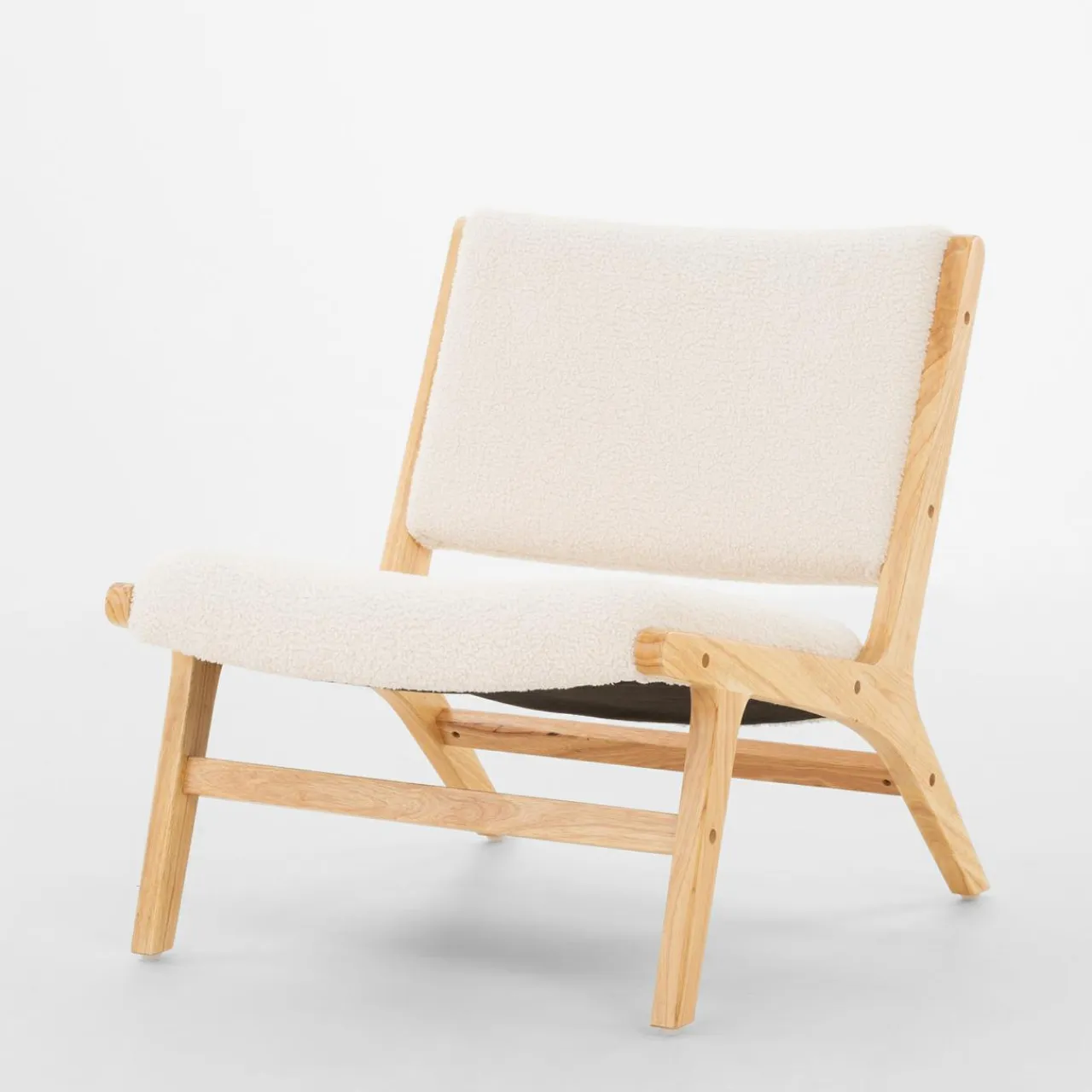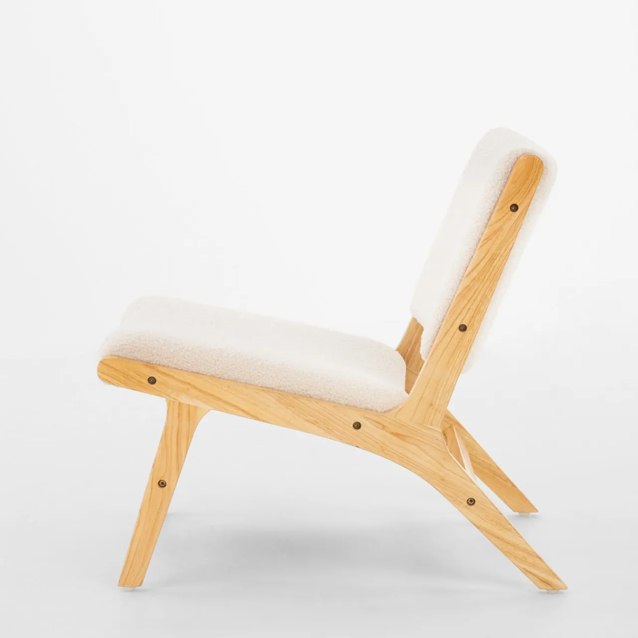 - Połączenie jasnego drewna i beżowej tkaniny boucle będzie pasować zarówno do skandynawskiego wnętrza, jak i tego urządzonego w stylu nowoczesnym.
