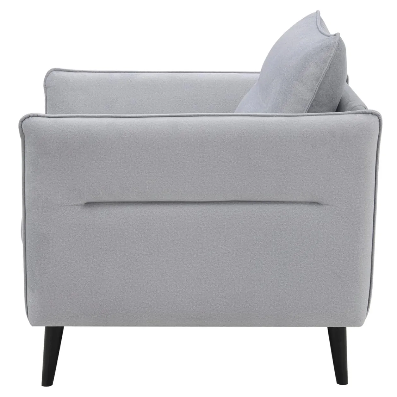 - Tapicerka została wykonana z miękkiej w dotyku tkaniny w jasnoszarym kolorze, przypominającej welur.
