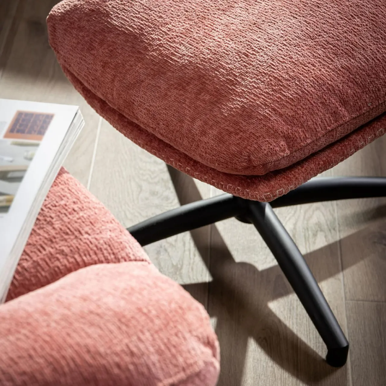 - Obicie fotela i podnóżka zostało wykonane z przyjemnej w dotyku tkaniny w kolorze różowym.