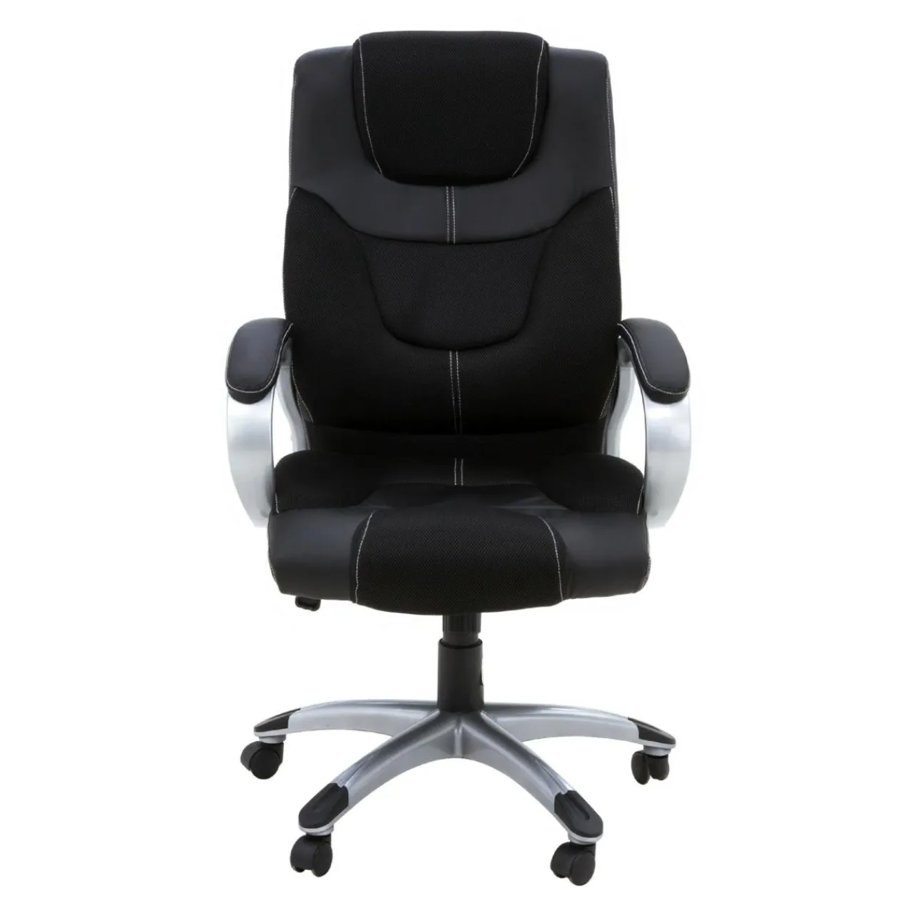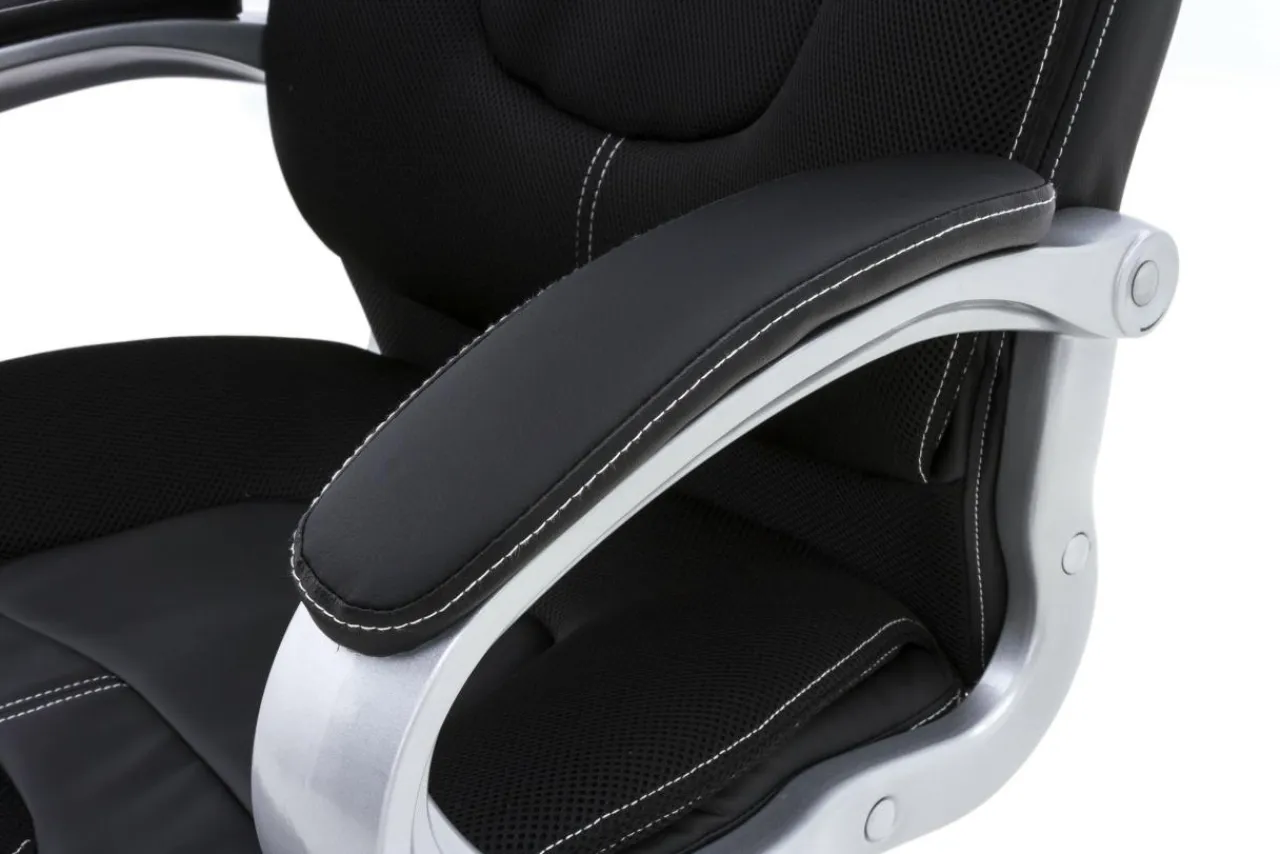 Eleganckie podłokietniki w kolorze „chrom”, wykończone czarną skórą ekologiczną, dają stabilne i komfortowe podparcie rąk podczas pracy przy biurku.