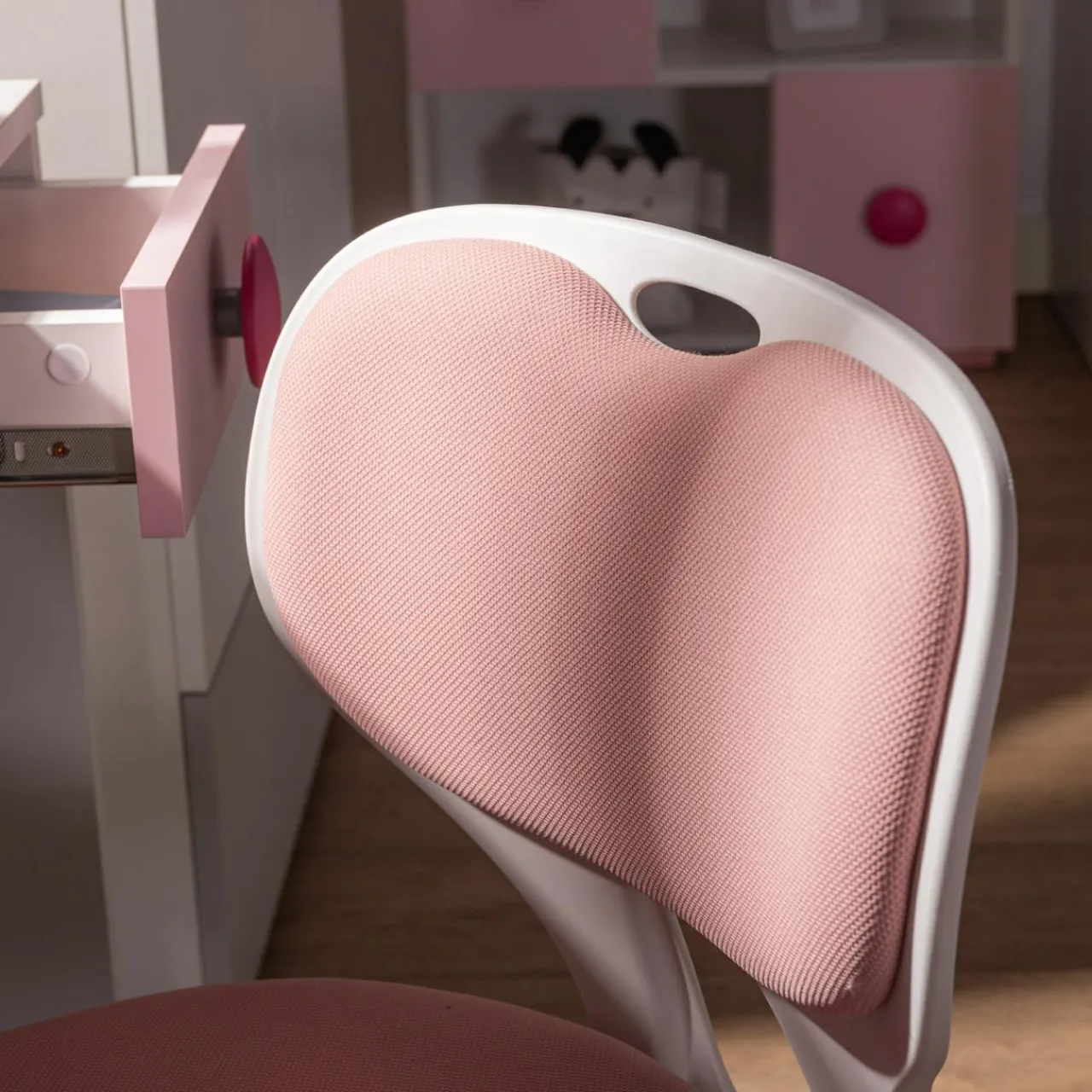 - Tapicerka została wykonana z przewiewnej siatki mesh w kolorze różowym.