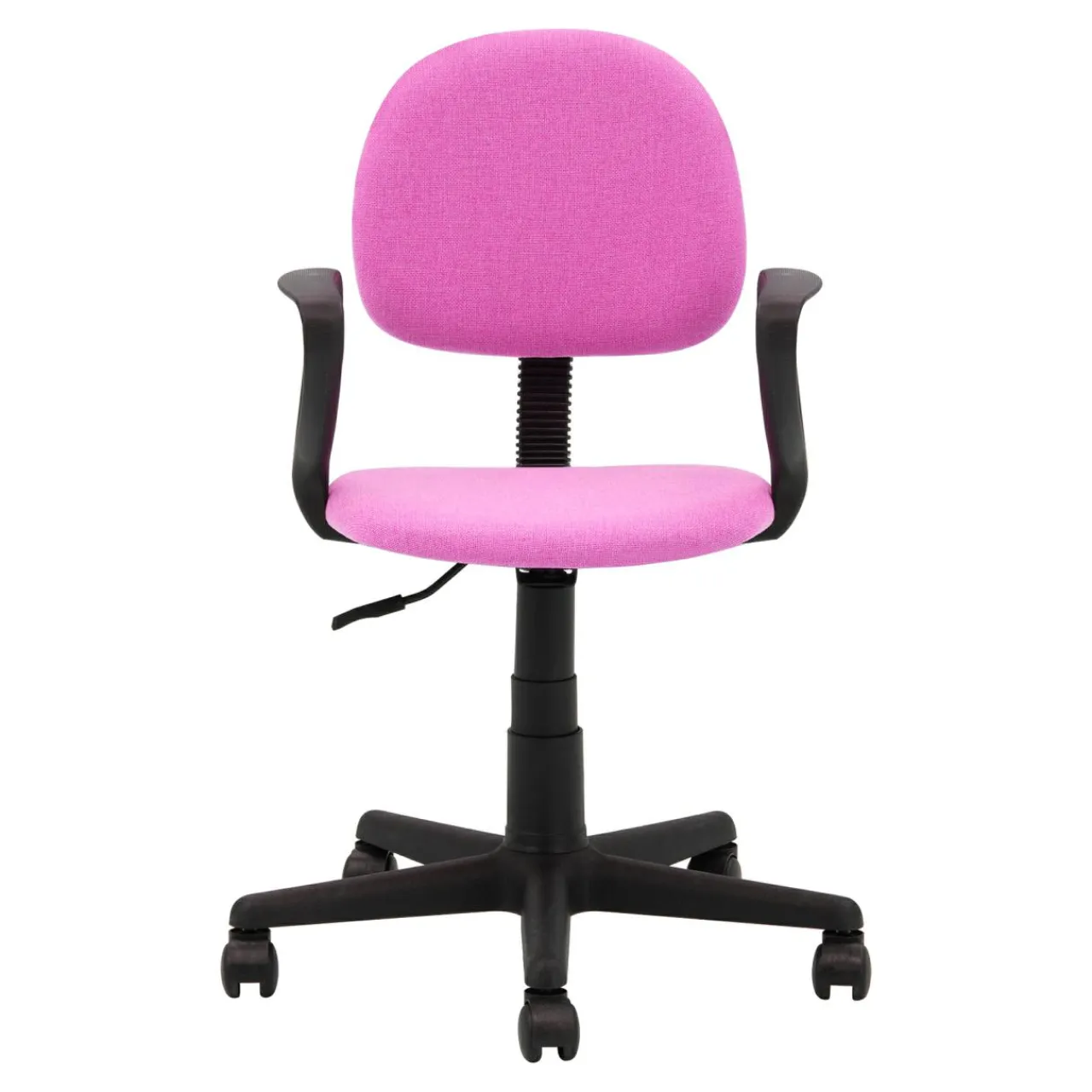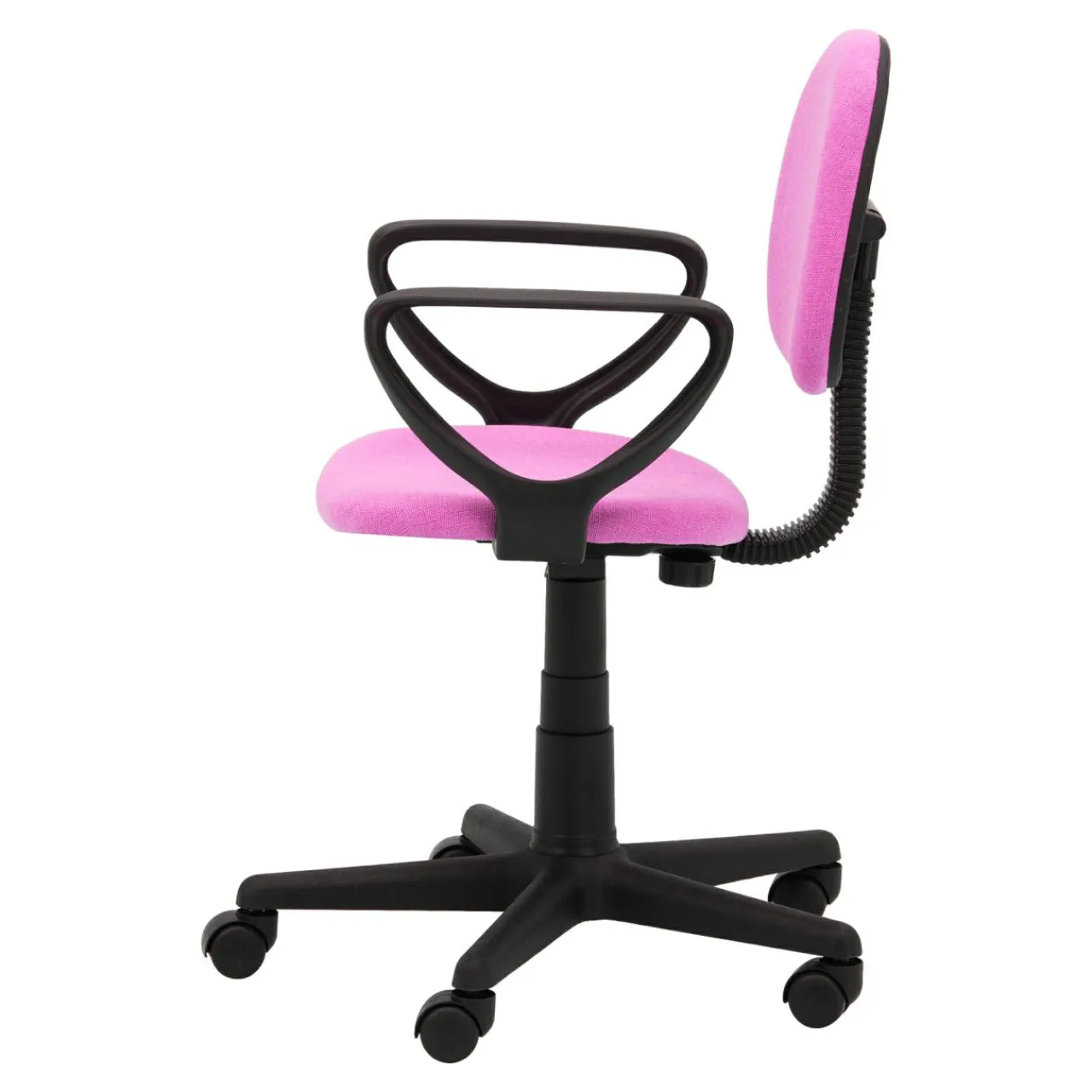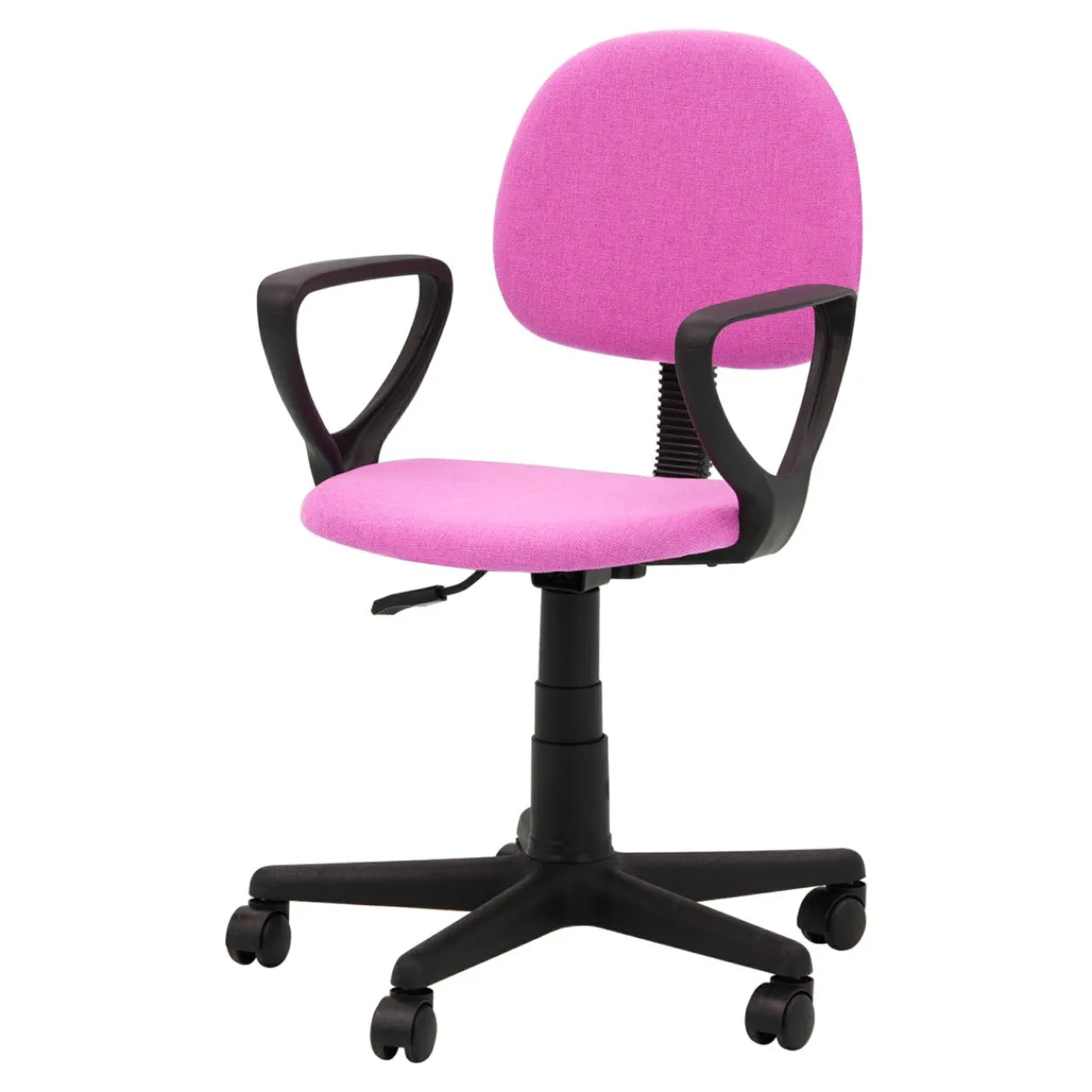 Wybierz fotel obrotowy NUPIG z różową tapicerką i czarną podstawą.