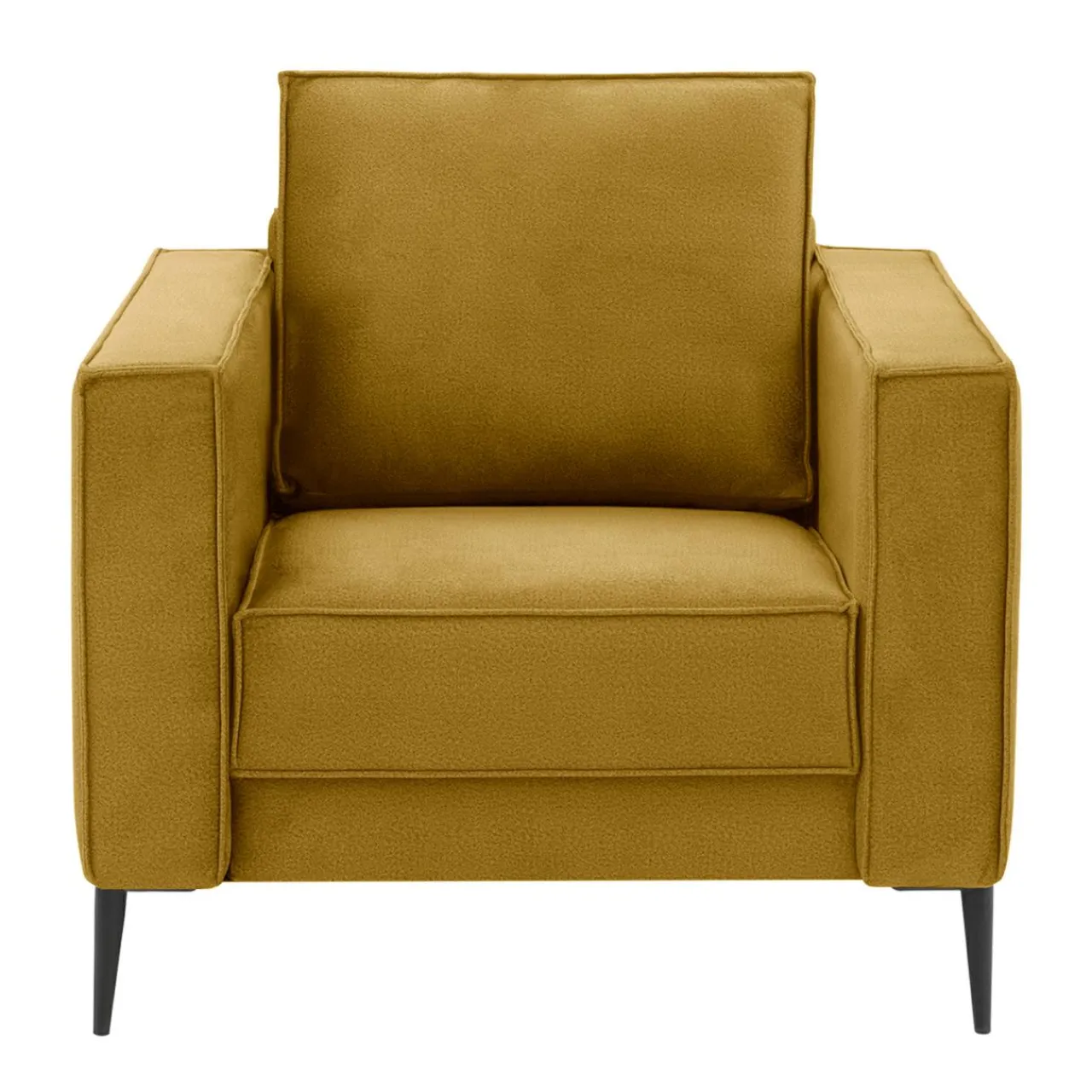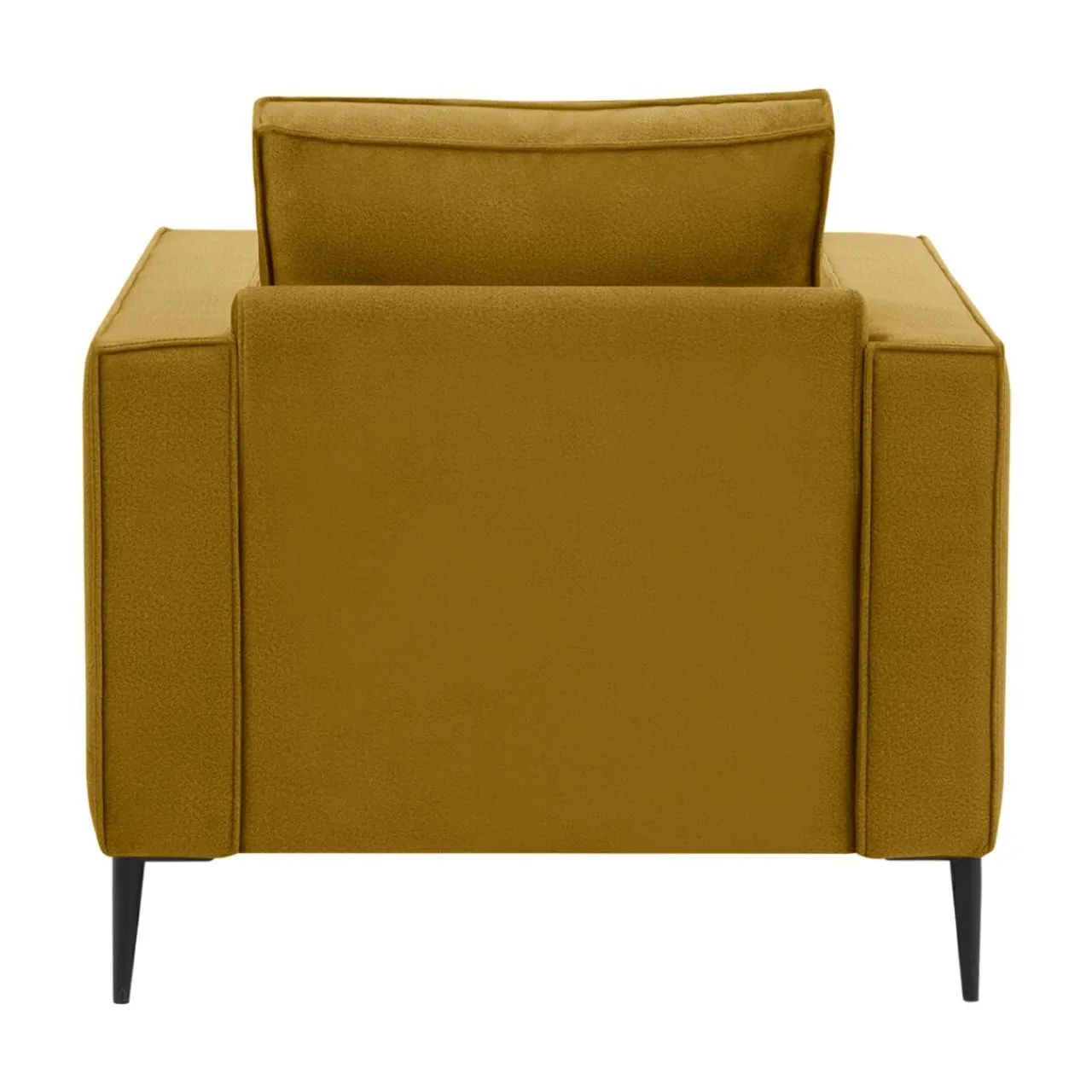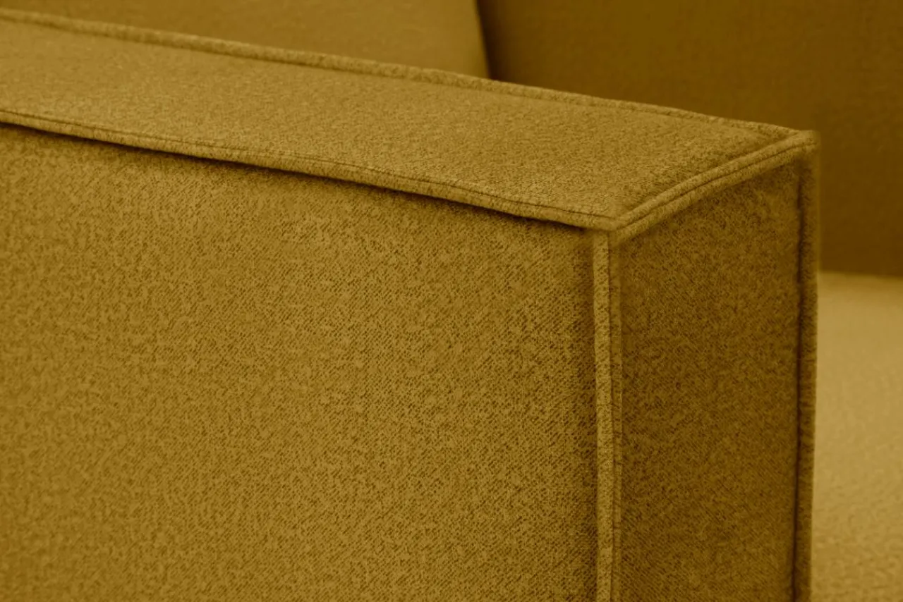 - Tapicerka została wykonana z miękkiej w dotyku, welurowej tkaniny w musztardowym kolorze.