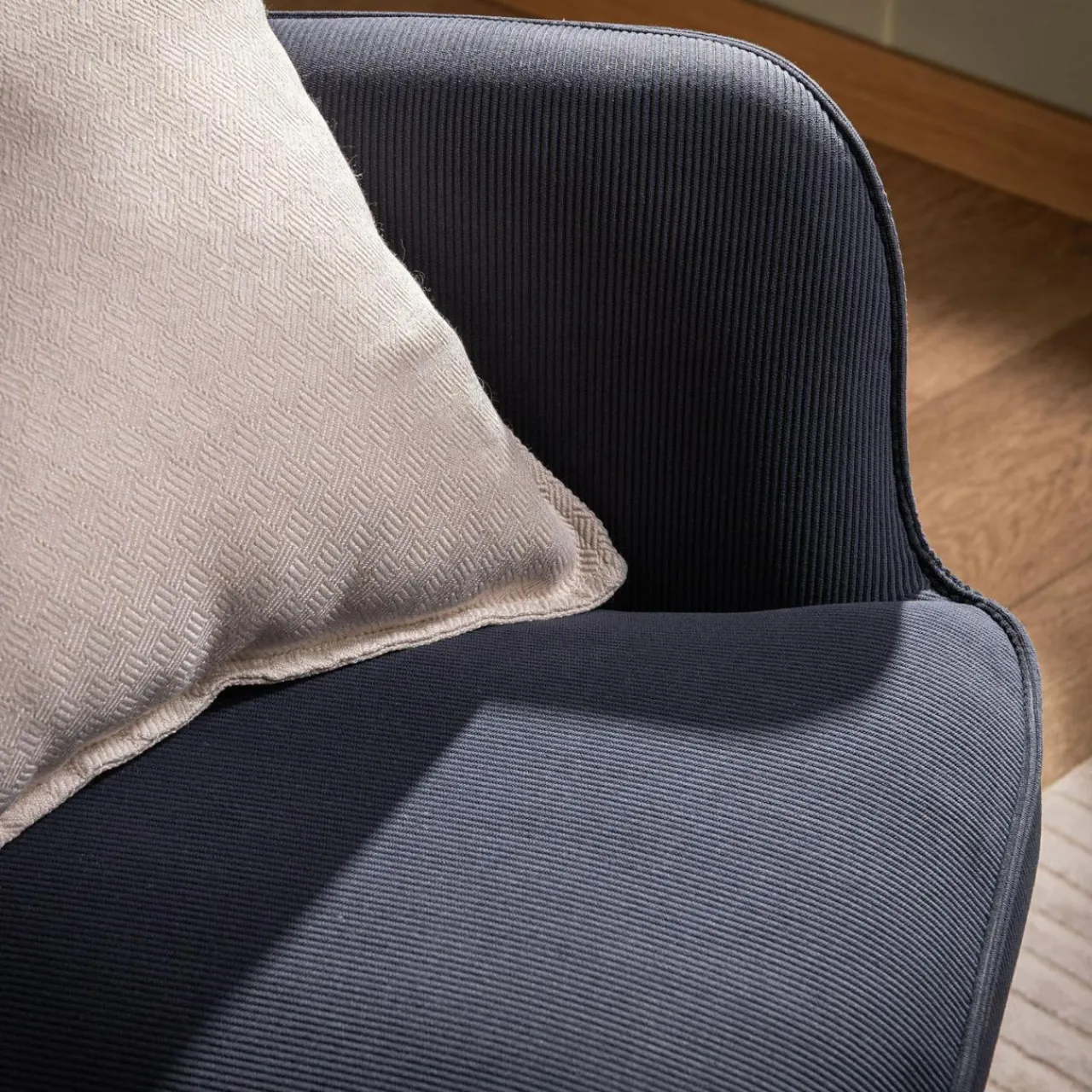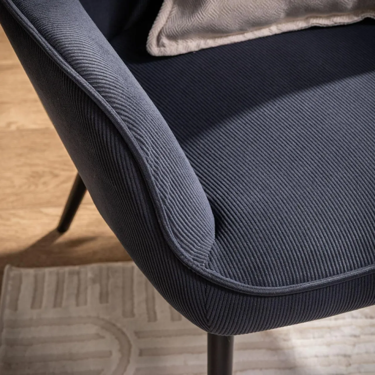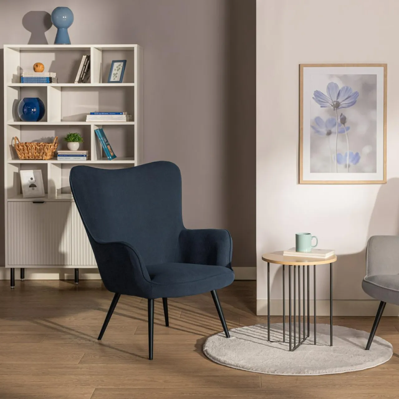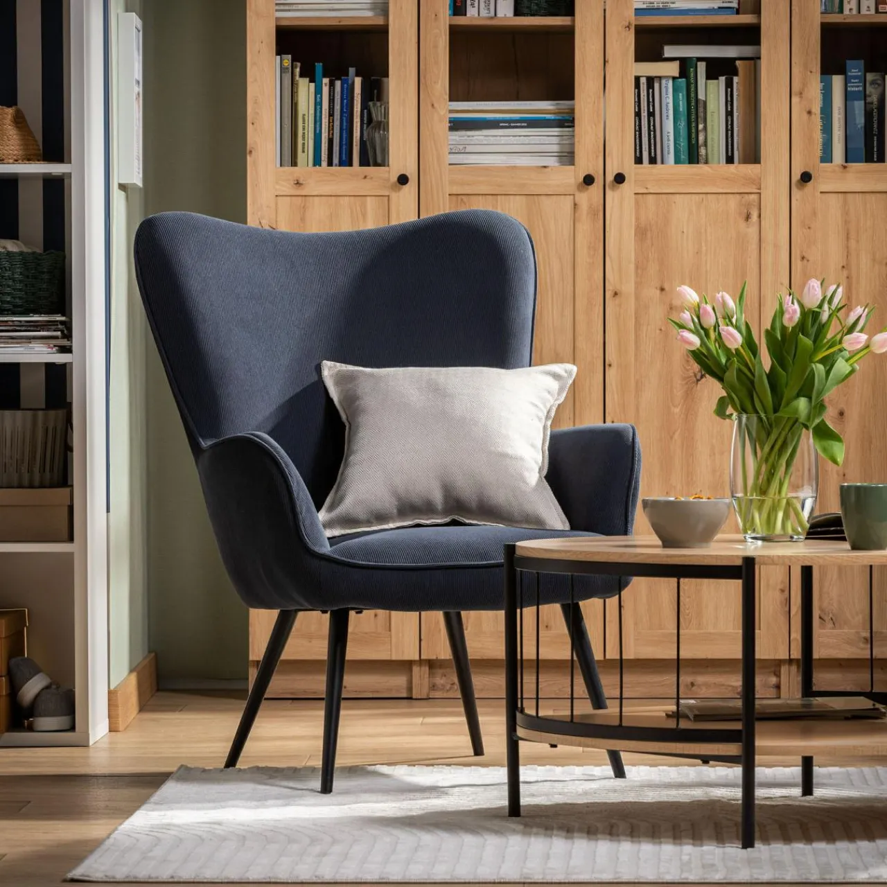 W Twoim salonie dominują błękity i granaty? Fotel JAZAN w granatowym odcieniu świetnie odnajdzie się w takim otoczeniu. Prosta forma inspirowana fotelem uszakiem w zależności od dodatków będzie pasować do salonu urządzonego w stylu minimalistycznym lub nowoczesnym.