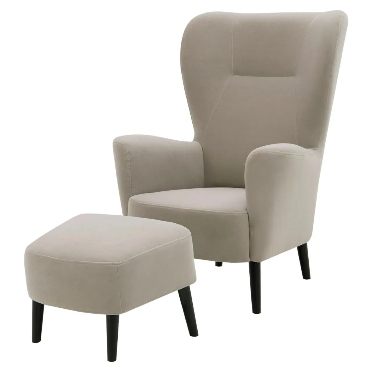 Klasyczna stylizacja fotela kojarzy się z wygodą i komfortem, a tkanina w szaro-beżowym odcieniu połączona z czarnymi nóżkami podkreśla jego elegancję i uniwersalność mebla.