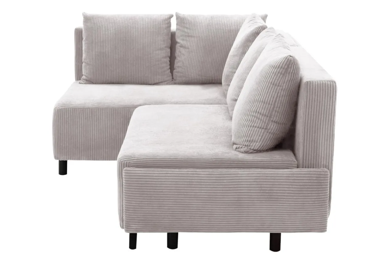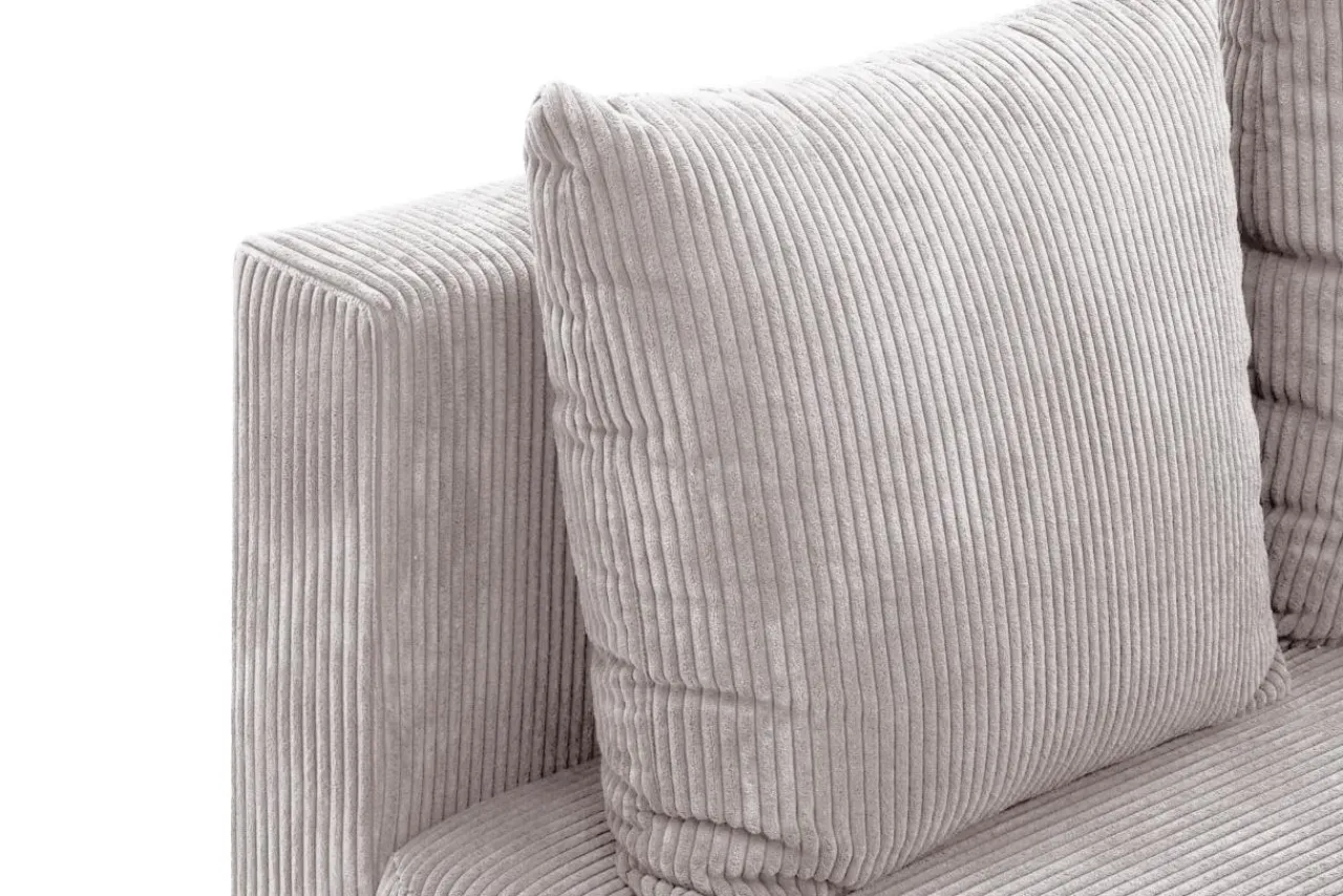 Narożnik w jasnoszarym kolorze przyciąga wzrok miękką, sztruksową tapicerką.