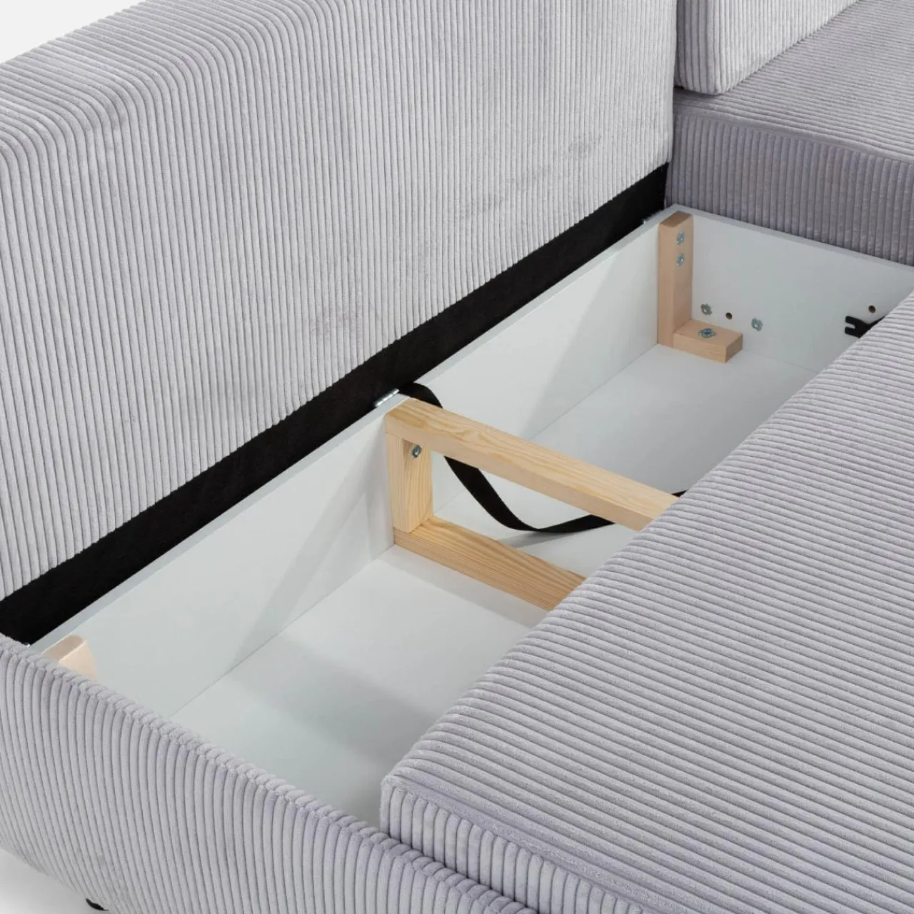 - Pojemnik pod siedziskiem to dodatkowe miejsce na pościel, poduszki lub inne domowe tekstylia.