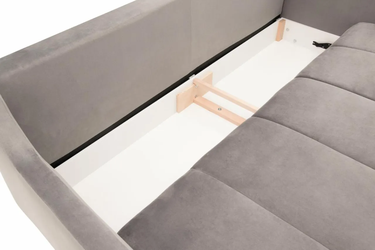 - Pod siedziskiem znajduje się pojemnik na pościel, który przyda się na przechowanie pościeli lub poduszek oparciowych na czas rozłożenia.