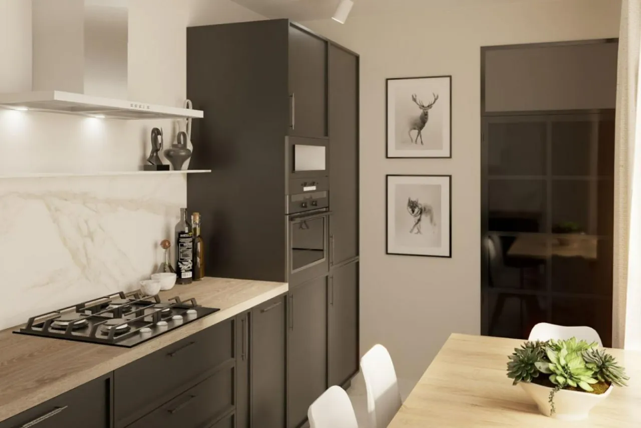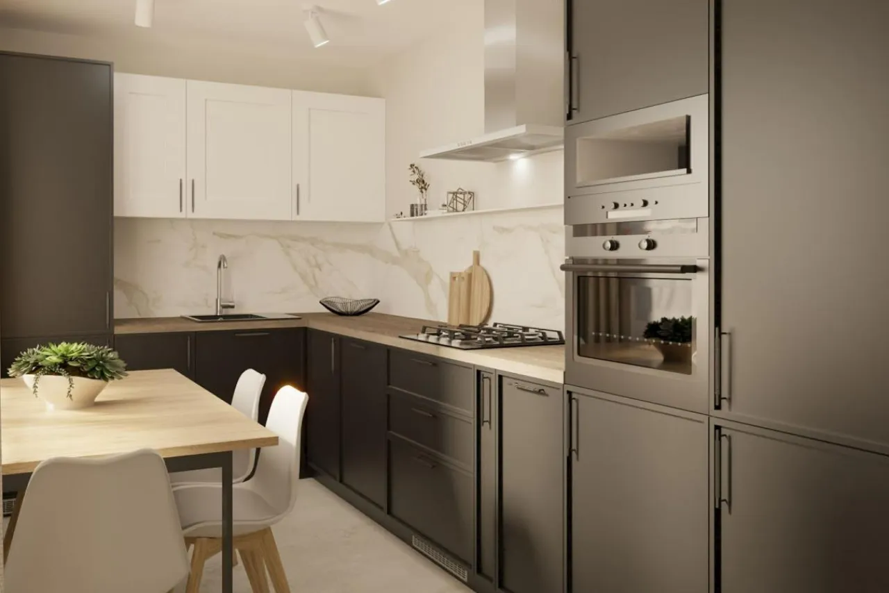 Front drzwi został wykończony folią PVC w grafitowym kolorze. Dzięki temu estetycznie prezentuje się w połączeniu z drewnianymi blatami i wśród metalowych dodatków. Takie wykończenie spodoba się szczególnie miłośnikom stylu industrialnego.