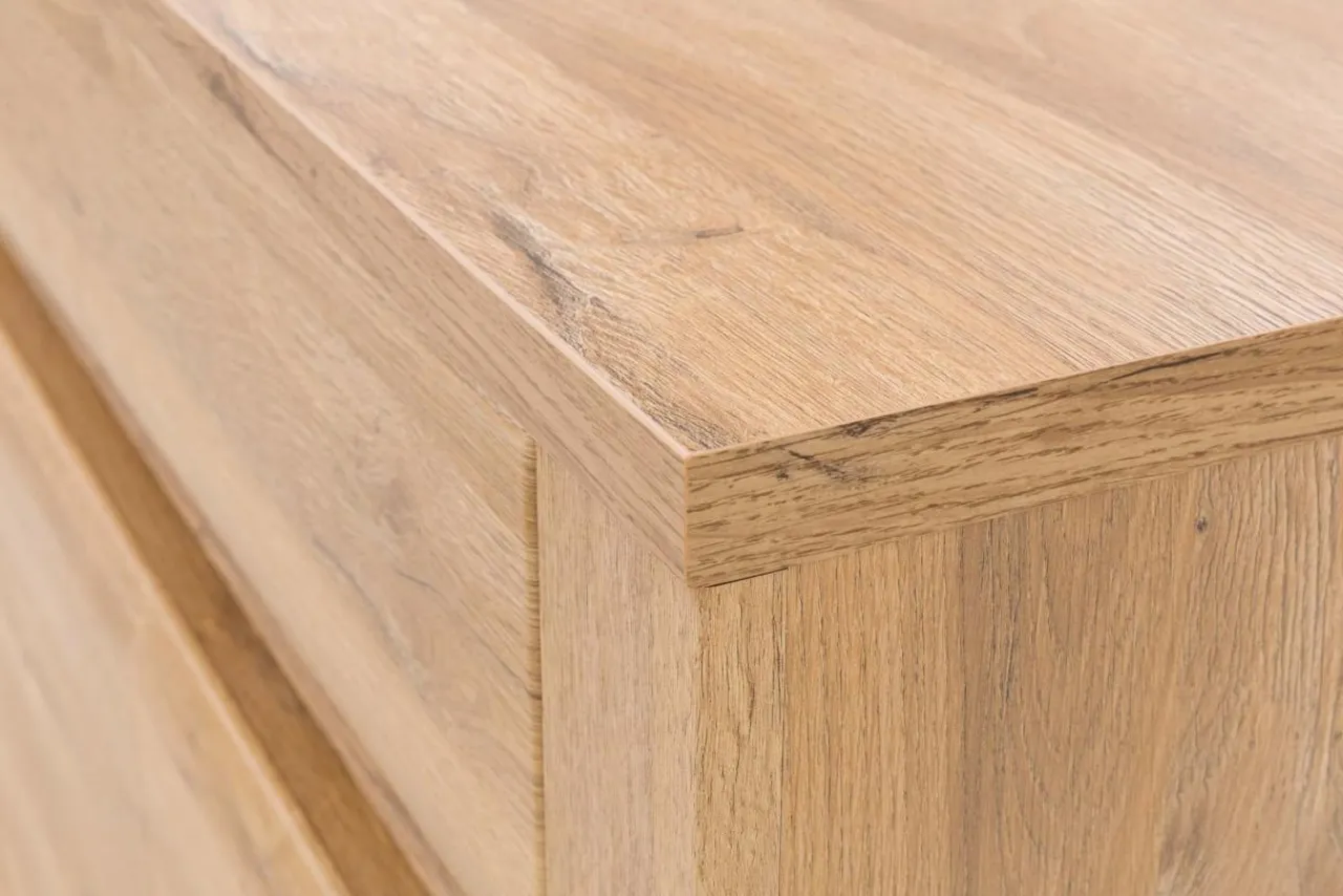 Dzięki szerokim listwom wzdłuż boków szafki oraz krótkim, nieregulowanym nóżkom meble z kolekcji SANDY sprawiają wrażenie solidnych i masywnych.