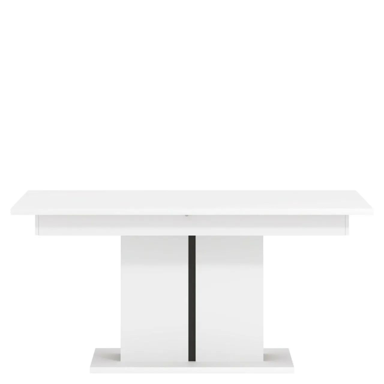 - Korpus, blat oraz kolumnowa podstawa stołu są wykonane z płyty wiórowej i wykończone matowym laminatem w klasycznej bieli przełamanej czarną wstawką wzdłuż kolumny;