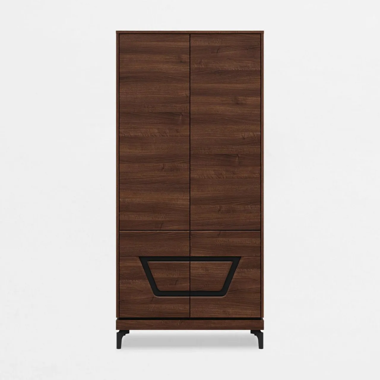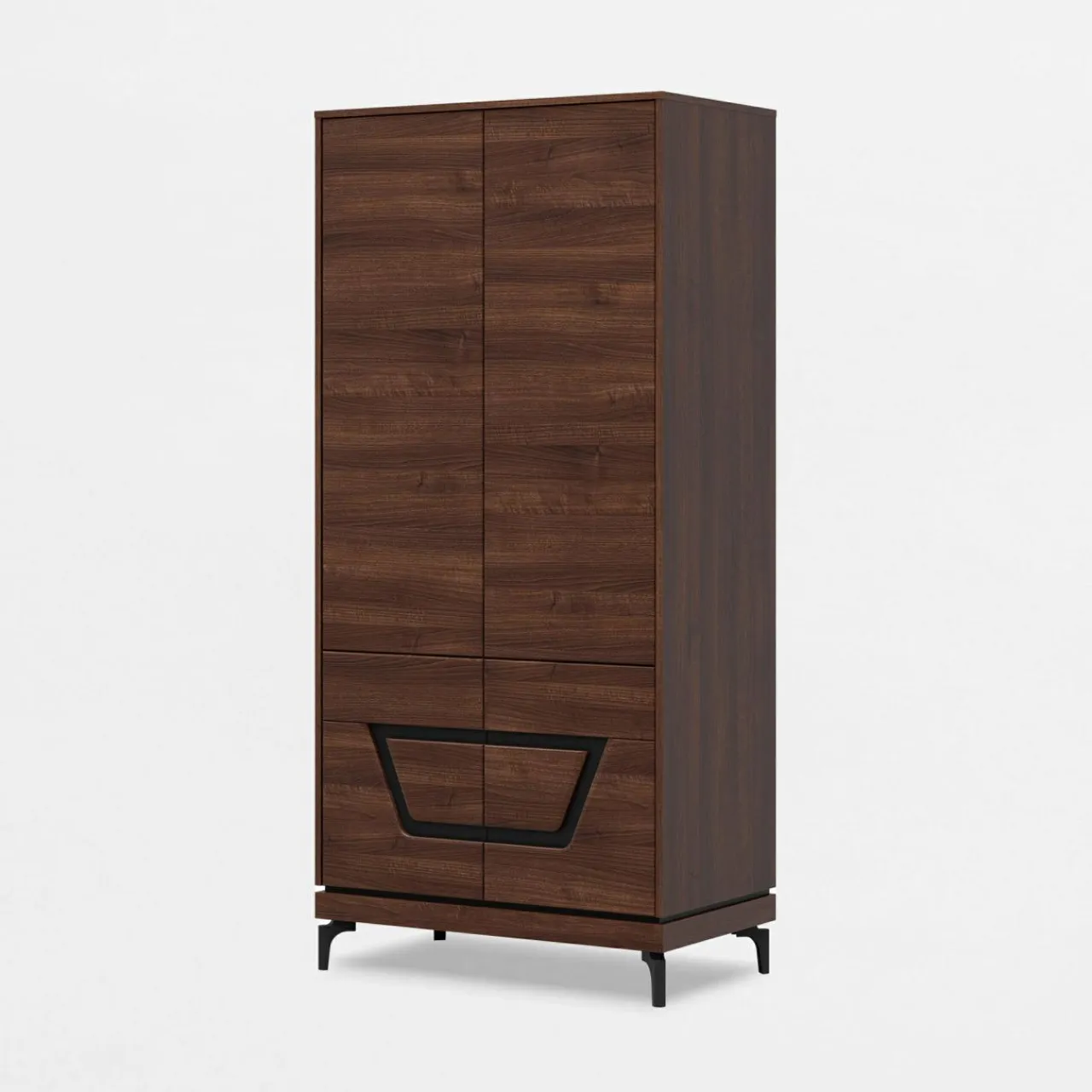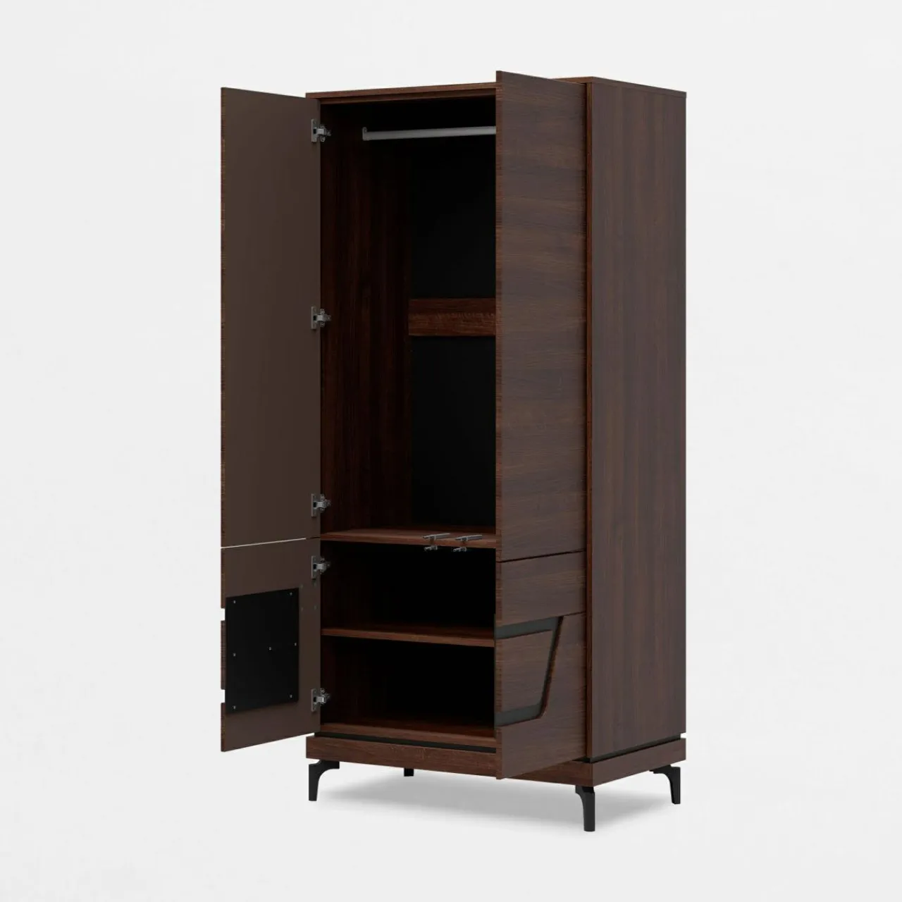 - Meble wykończone są laminatem z rysunkiem drewna. Ciemny, orzechowy kolor posiada niepowtarzalny układ słojów na każdym meblu.