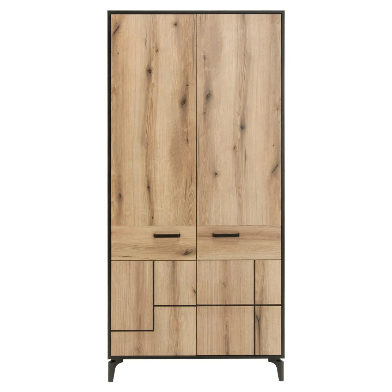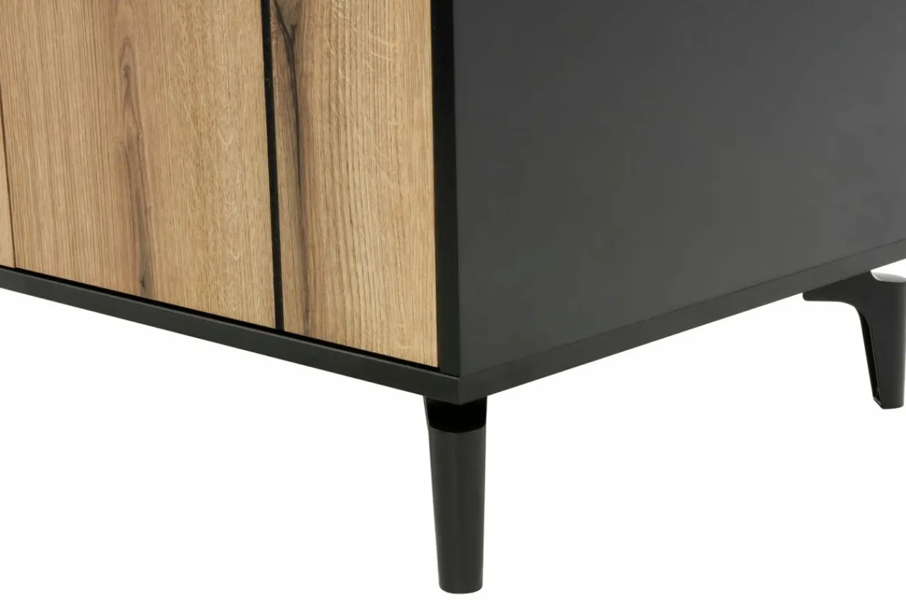 Meble wykonane z płyty meblowej wykończone są laminatem w kolorze czarnym i dąb evoke. Naturalny rysunek drewna z widocznymi sękami i słojami podkreślą przytulną atmosferę.
