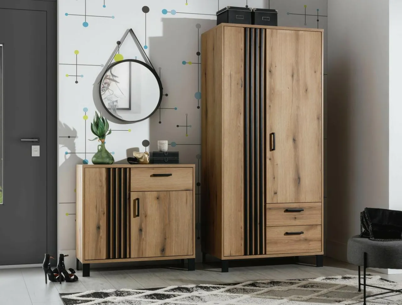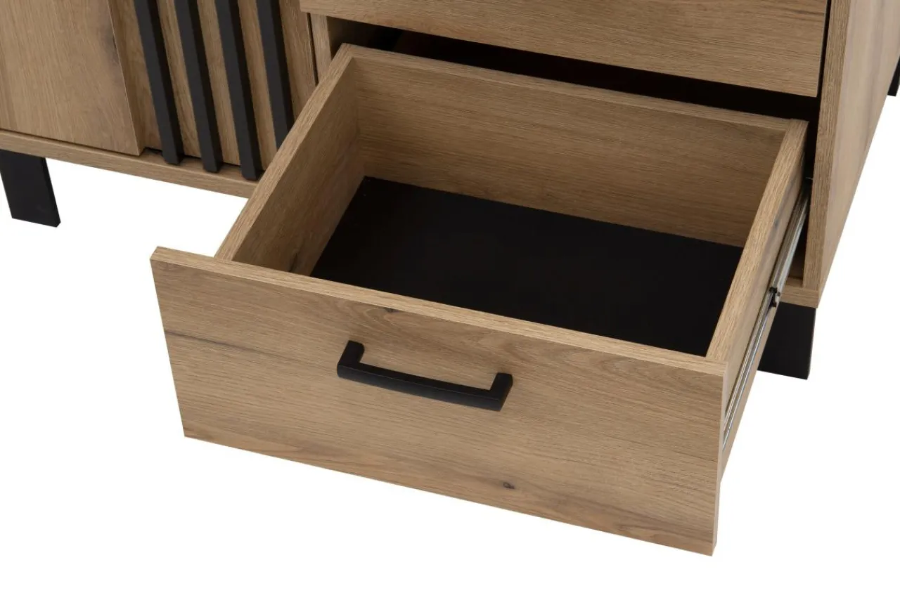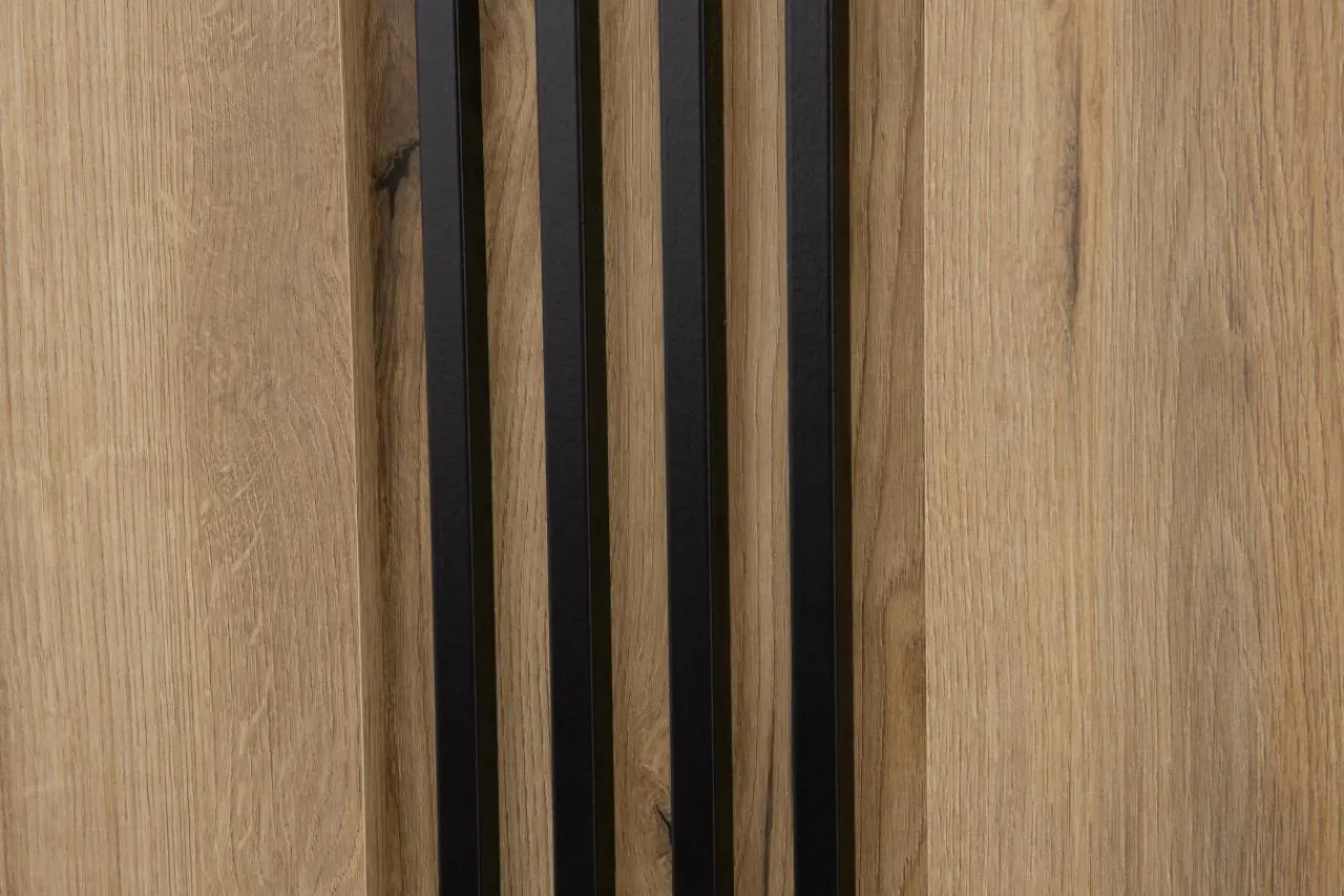 Kolekcja NOEL to połączenie laminatu imitującego drewno z czarnymi nóżkami i lamelami na froncie. To wszystko sprawia, że mebel odnajdzie się we wnętrzach urządzonych w stylu nowoczesnym i japandi.