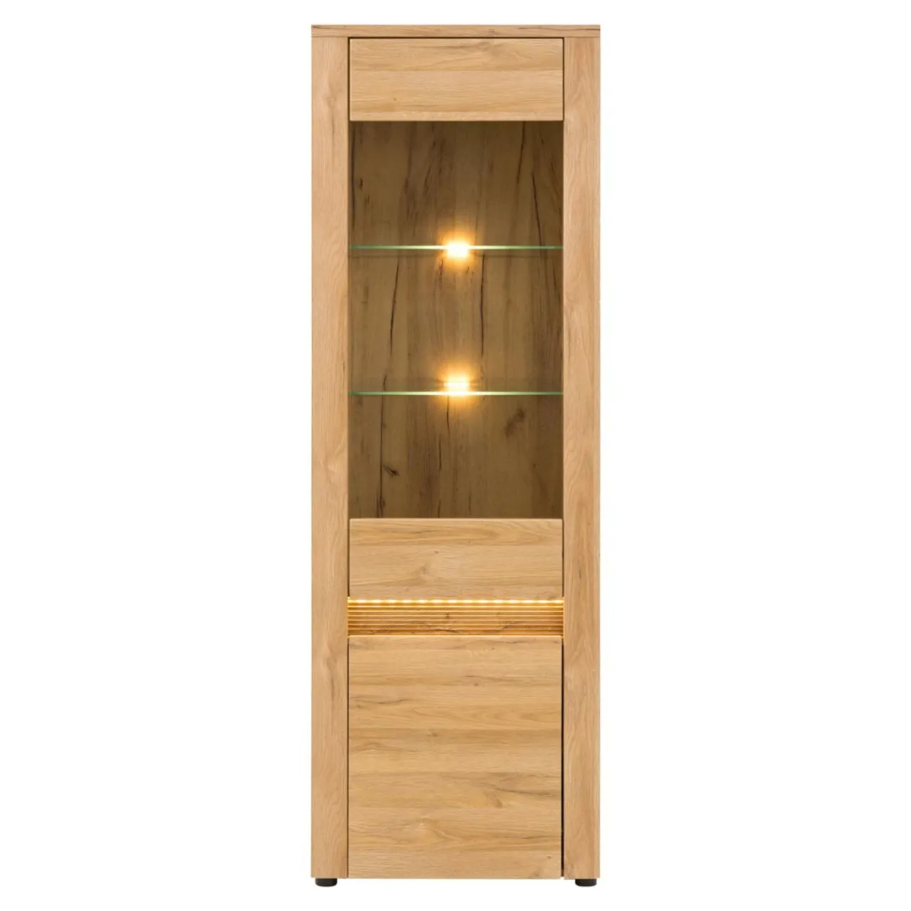 Wnętrze witryny kryje praktyczne wnęki ukryte za pełnymi drzwiami oraz podświetlane półki za szklanymi drzwiami, idealne do wyeksponowania porcelany lub innych dodatków.