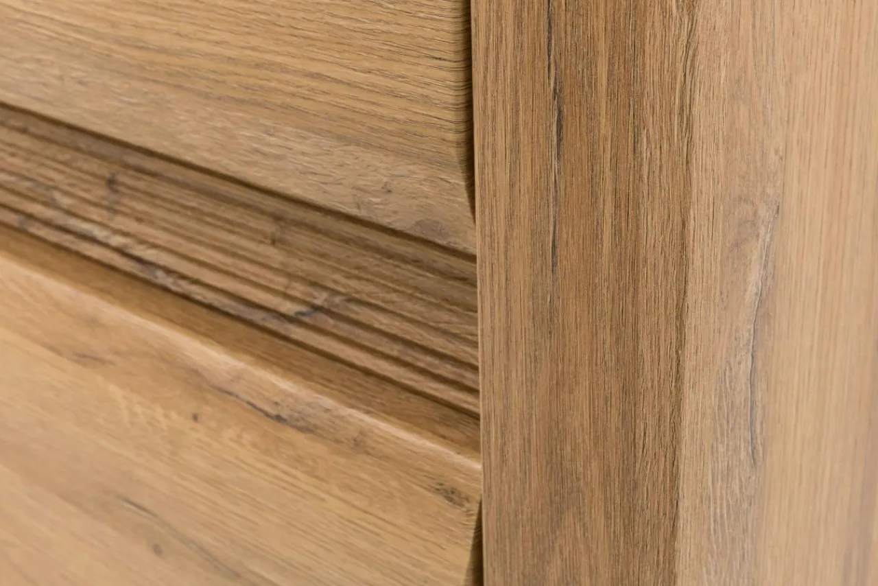 Brak widocznych uchwytów i delikatne żłobienia na froncie dodają meblom elegancji.