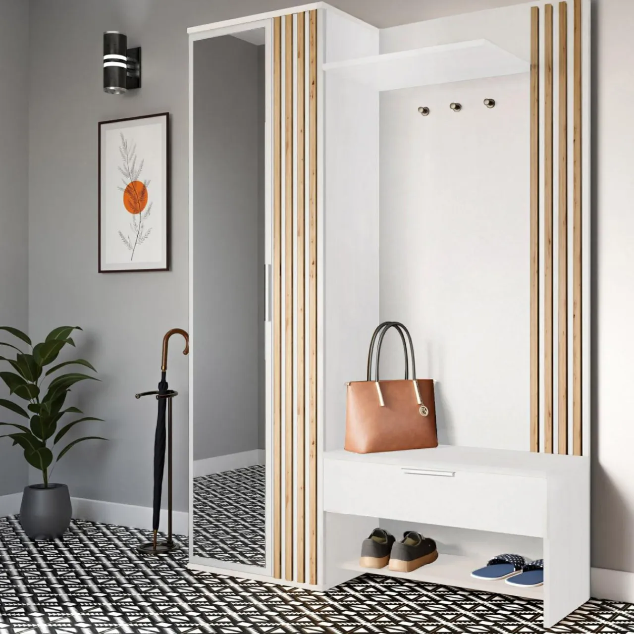 Biały kolor w połączeniu z niecodzienną dekoracją będzie pasował do przedpokoju w stylu nowoczesnym.