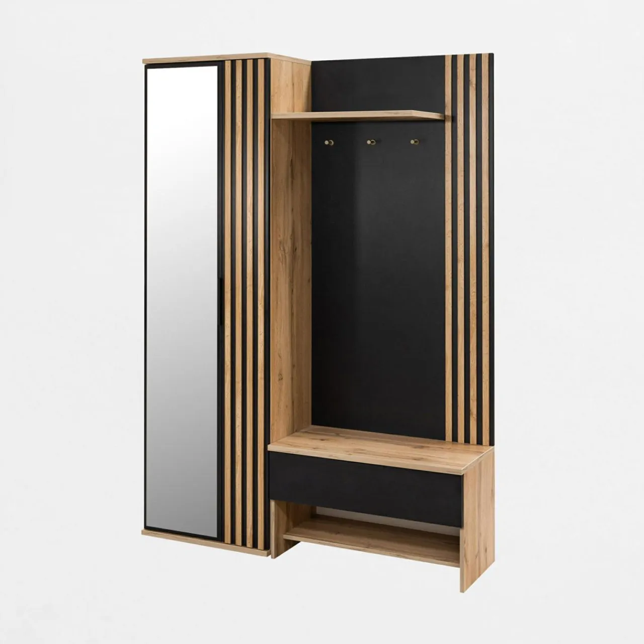 Dekoracyjne lamele w kolorze dąb wotan sprawiają, że przedpokoju nabiera minimalistycznego stylu z nutką japandi. Długie i cienkie lamele wydłużają optycznie ścianę, na której znajduje się mebel.