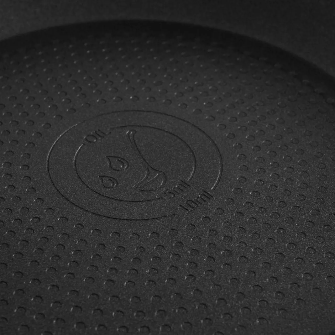 - Wyróżnia ją estetycznie wykończenie – uwagę zwraca charakterystyczna ikona oleju na środku patelni.