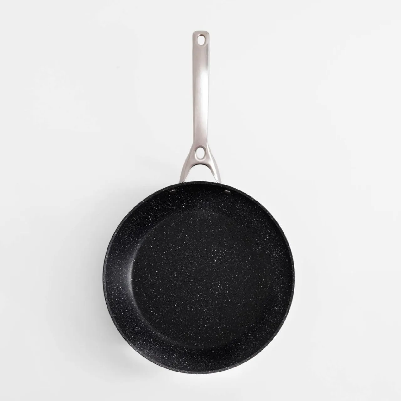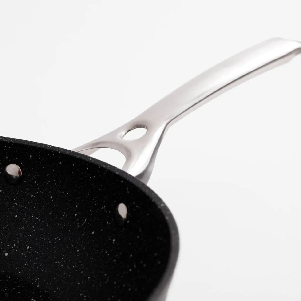 Patelnia jest wykonana z kutego aluminium, jej rączka natomiast ze stali nierdzewnej.